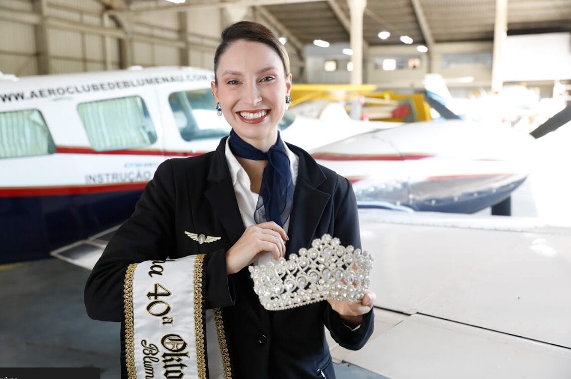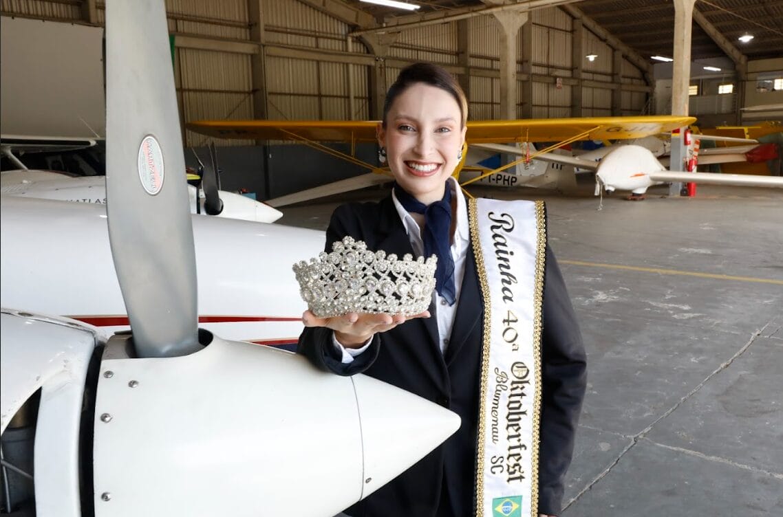 Se tem uma coisa que a rainha da Oktoberfest Blumenau de 2025 não parece ter é medo de mudanças. Gabrielle Kratz, de 29 anos, descobriu uma nova paixão durante o reinado e agora mira uma carreira totalmente diferente da que tinha antes de virar representante da festa. Se tudo der certo, a engenheira têxtil alçará voos mais altos e trabalhará como comissária de voo.