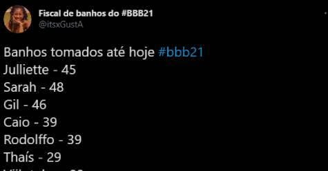 Me seguiam gente— Fiscal de banhos do #BBB21 (@itsxGustA) March 9, 2021Continua depois da publicidade