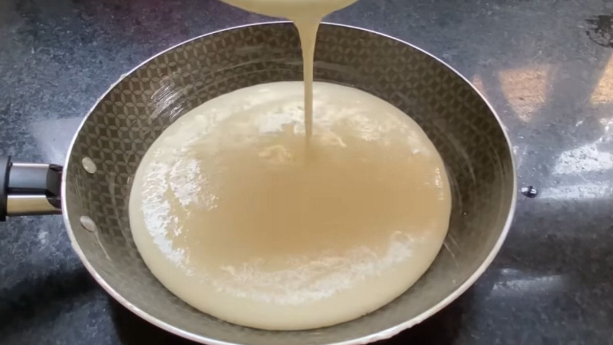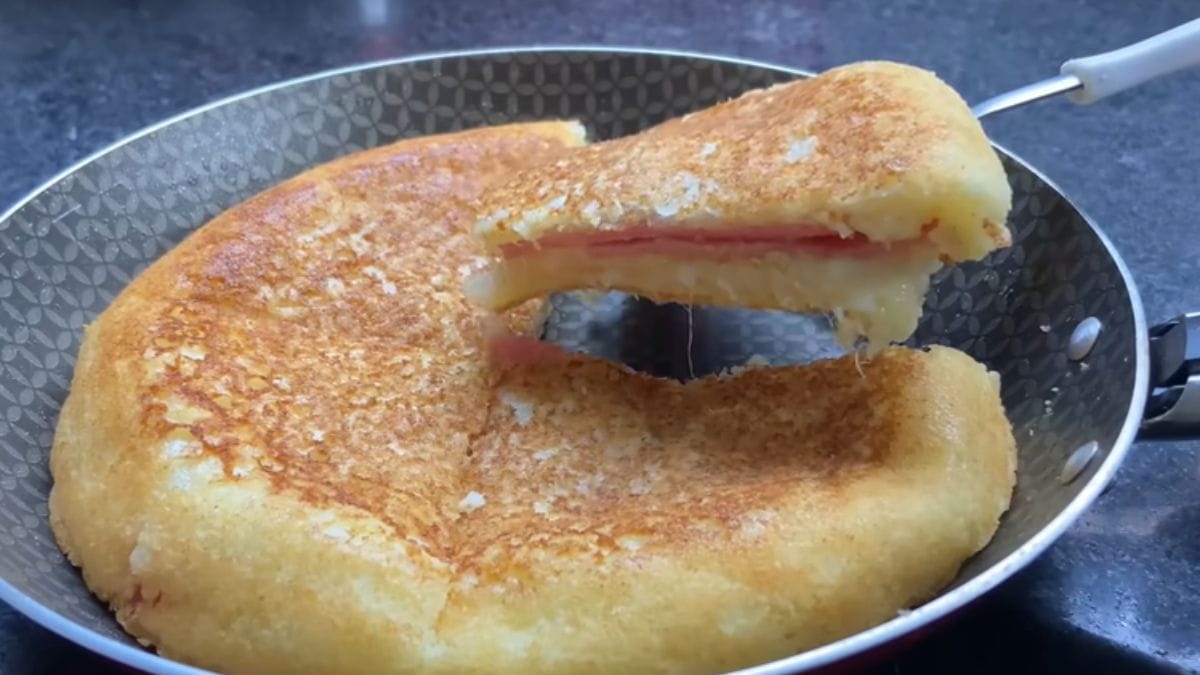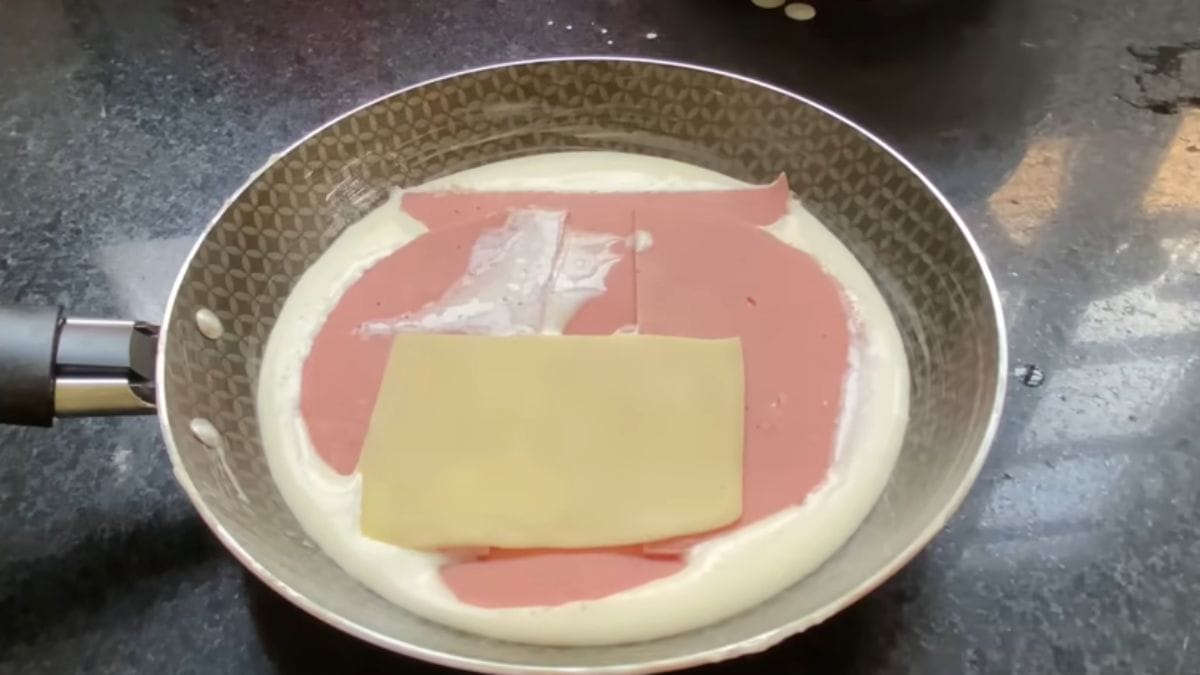 Unte uma frigideira e derrame a massa. Acrescente o recheio que desejar. No vídeo, a cozinheira sugere adicionar mortadela e queijo. Em seguida, cubra o lanche com mais uma camada de massa.
