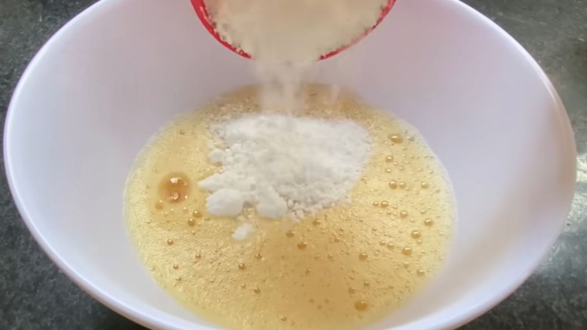 Primeiro, bata o ovo em um recipiente. Em seguida, acrescente a tapioca, a maizena e o fermento e misture. Adicione o leite e mexa novamente.