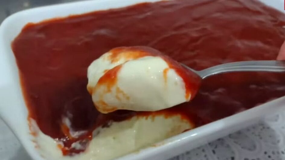 - Com o creme já firme e a calda de goiabada fria, espalhe a calda por cima do creme, cobrindo toda a superfície;