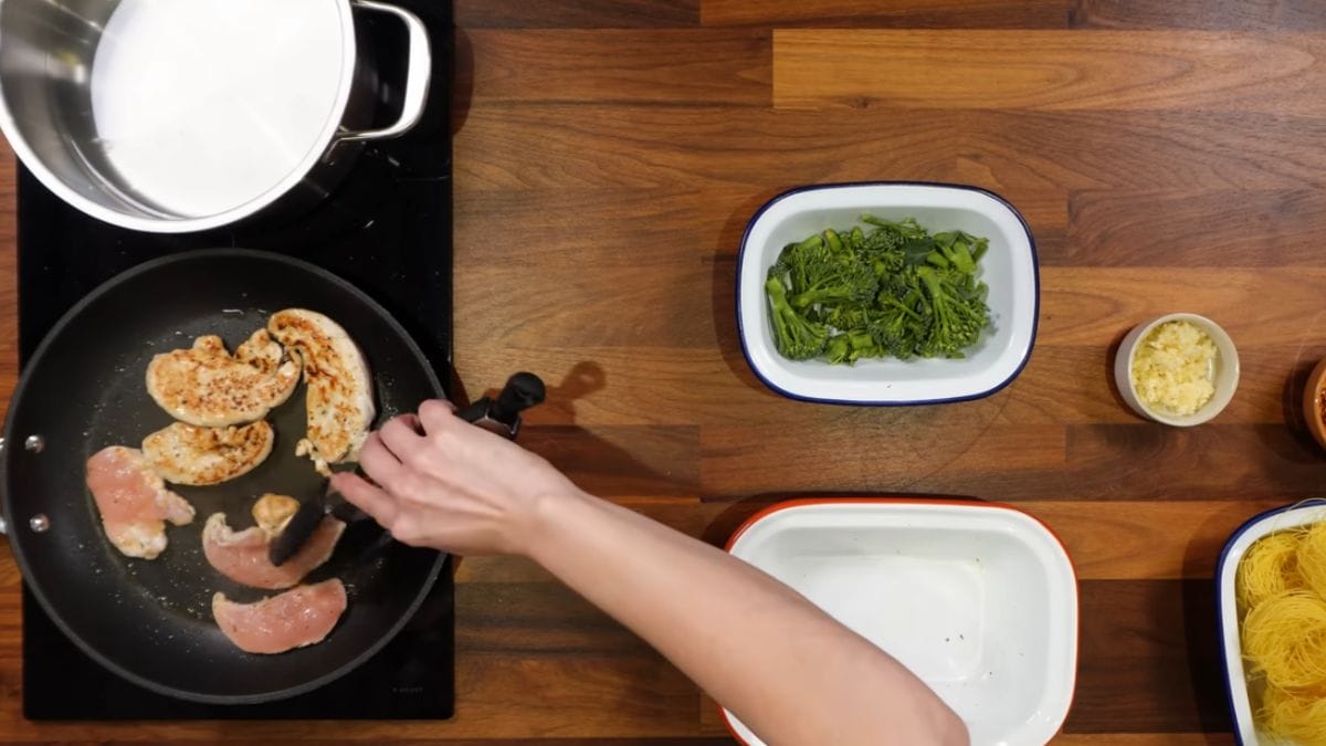 Agora, coloque o brócolis em uma panela com água fervendo. Em seguida, acrescente o macarrão. Enquanto o macarrão cozinha, prepare o alho em uma frigideira com azeite e pimenta calabresa.