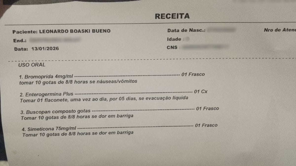 A mãe conta que saiu da UPA e foi direto para uma farmácia comprar os medicamentos indicados pela profissional. Ela afirma que iniciou as doses no mesmo momento. No entanto, Leonardo ainda estava mal na quarta-feira (14) pela manhã.