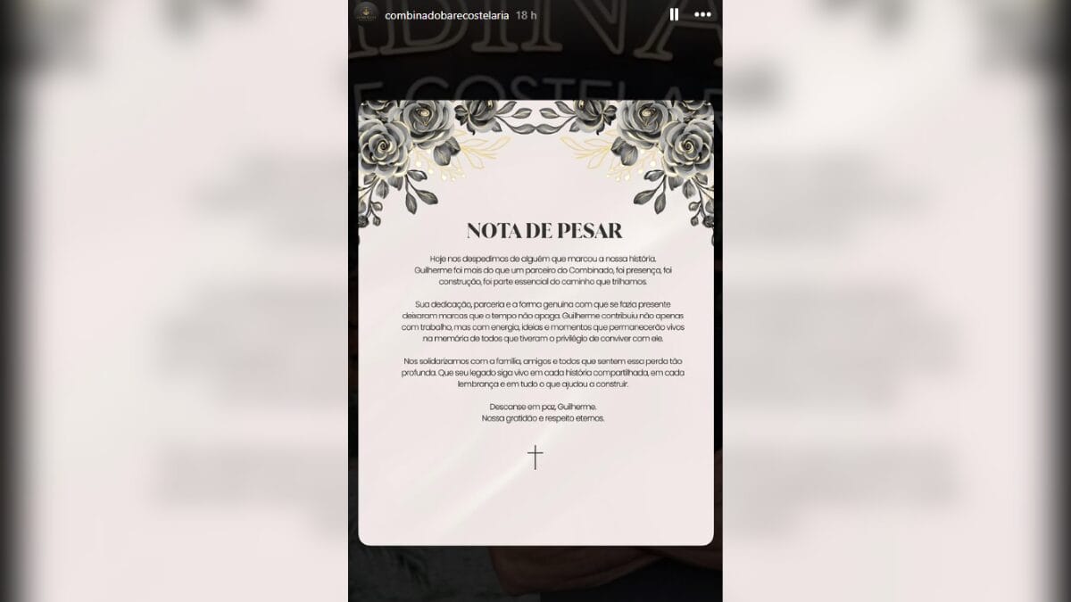 “Hoje nos despedimos de alguém que marcou a nossa história. Guilherme foi mais do que um parceiro do Combinado, foi presença, foi construção, foi parte essencial do caminho que trilhamos. Sua dedicação, parceria e a forma genuína com que se fazia presente deixaram marcas que o tempo não apaga. Guilherme contribuiu não apenas com trabalho, mas com energia, ideias e momentos que permanecerão vivos na memória de todos que tiveram o privilégio de conviver com ele”, diz a nota da churrascaria.