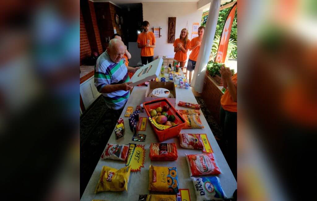 A surpresa ocorreu neste domingo (2). No local, a mesa foi toda decorada com produtos, que simulavam gôndolas de supermercado. Também foram colocados banners de ofertas, parecidas com as promoções dos produtos, além de que a família vestiu roupas como se fosse funcionário do local.