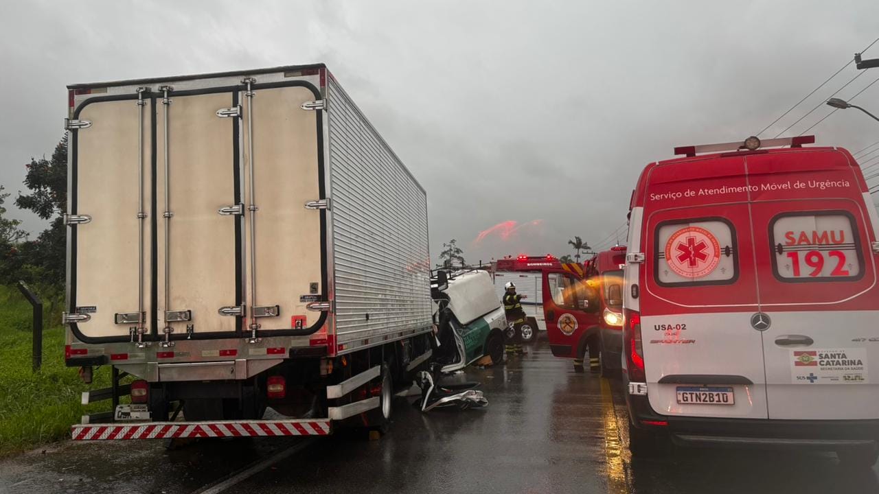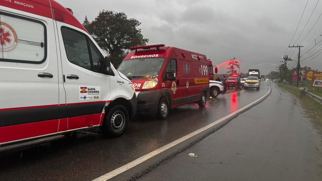 O motorista do carro, uma Saveiro de uma empresa de telecomunicações, ficou gravemente ferido e foi levado para o Hospital Marieta Konder Bornhausen pela aeronave do Arcanjo 03.