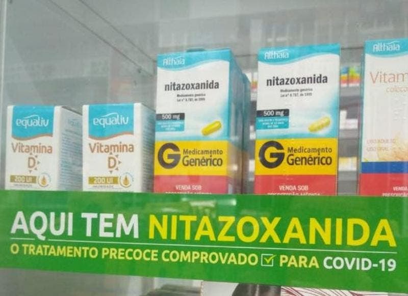 “Aqui tem Nitazoxanida”, é o que destacam as letras garrafais na prateleira de uma farmácia no Estreito, em Florianópolis. A curta frase seria irrelevante não fosse o complemento que aparece logo abaixo: “o tratamento precoce comprovado para Covid-19”. No balcão de atendimento do estabelecimento e ao lado de uma prateleira onde há vitaminas e remédios para vermes, o adesivo nas cores verde e amarelo chama a atenção de quem aguarda por atendimento.