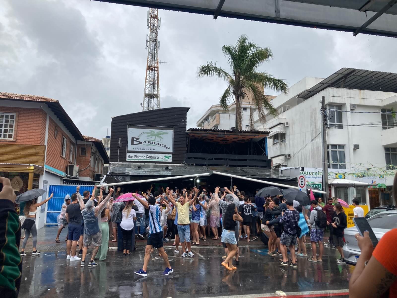 A festa branco e azul foi regada a cerveja, caipirinha e erva-mate. Em algumas mesas era possível ver os três itens distribuídos. Outro elemento presente e inusitado eram os guarda-chuva ou capas de proteção. A chuva não deu trégua em nenhum minutos do jogo.
