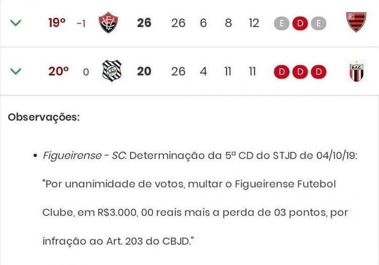 O Figueirense teve retirado três pontos na classificação da Série B 2019 por parte da CBF. De acordo com a Confederação Brasileira de Futebol, o Figueira teve pontuação descontada em punição pelo W.O. em jogo diante do Cuiabá, pela 17ª rodada. O Alvinegro acredita que houve erro de interpretação por parte da entidade ao receber o comunicado do julgamento realizado na semana passada.