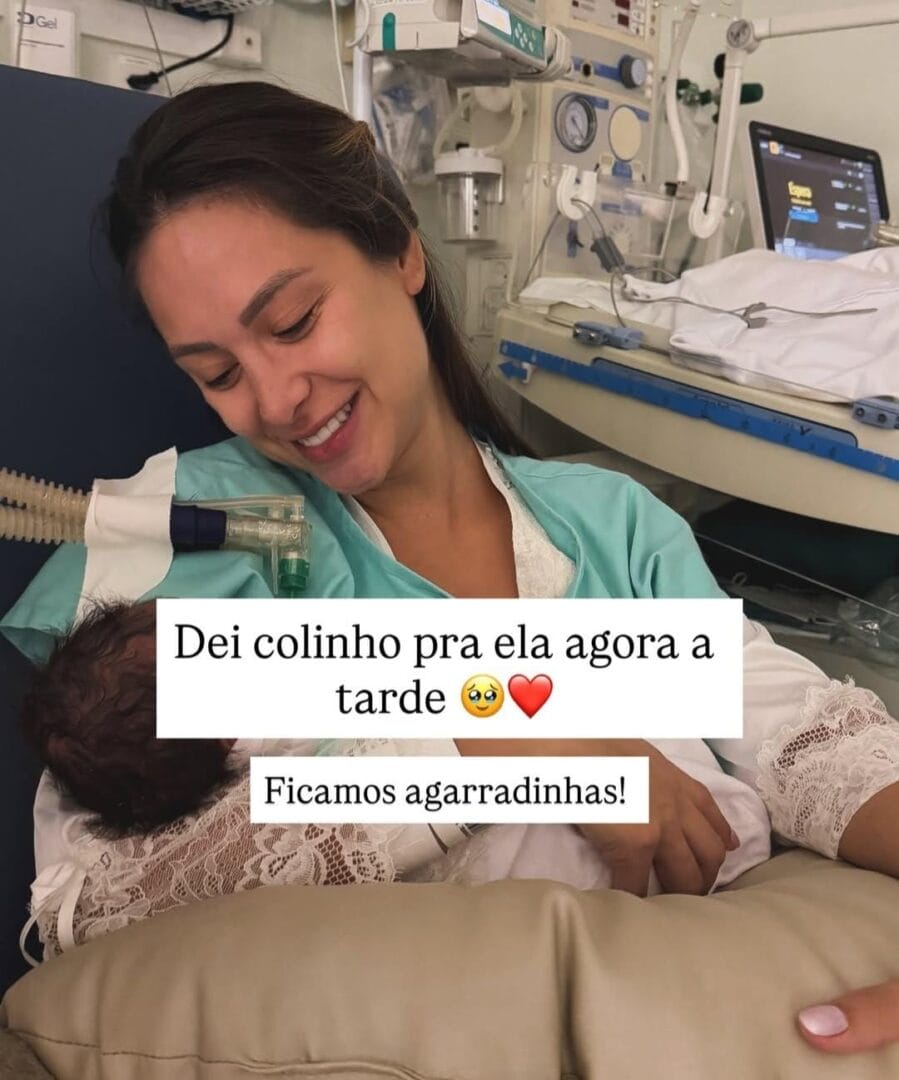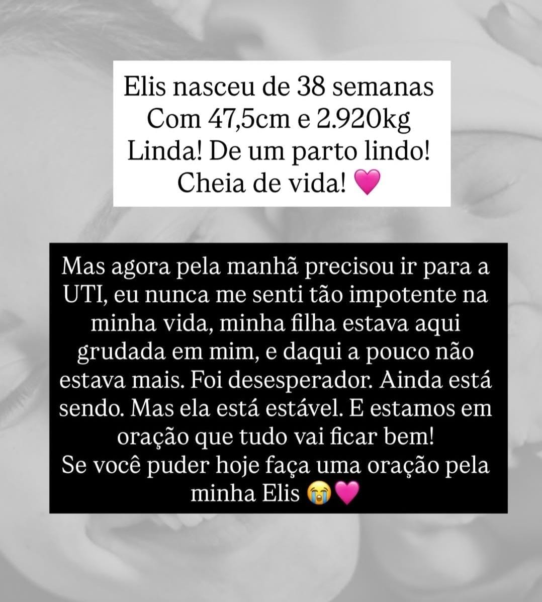 “Elis nasceu com 47,5 centímetros e 2,9 quilos. Agora pela manhã precisou ir para a UTI. Nunca me senti tão impotente na minha vida. Minha filha estava aqui grudada em mim e daqui a pouco não estava mais. Foi desesperador, ainda está sendo, mas ela está estável”, escreveu na segunda-feira.