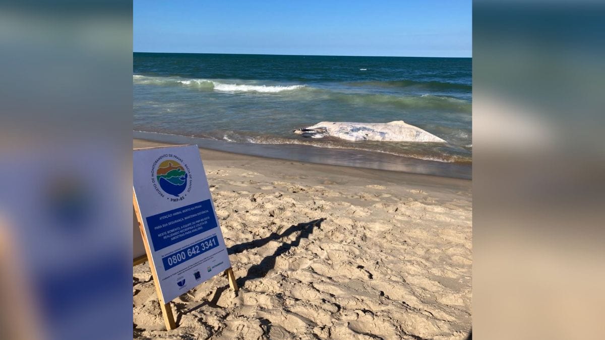 A baleia-jubarte (Megaptera novaeangliae) já está em avançado estado de decomposição, por isso a equipe técnica orienta que moradores e turistas evitem aproximações indevidas e desnecessárias, já que a carcaça pode oferecer riscos biológicos.