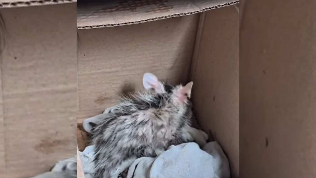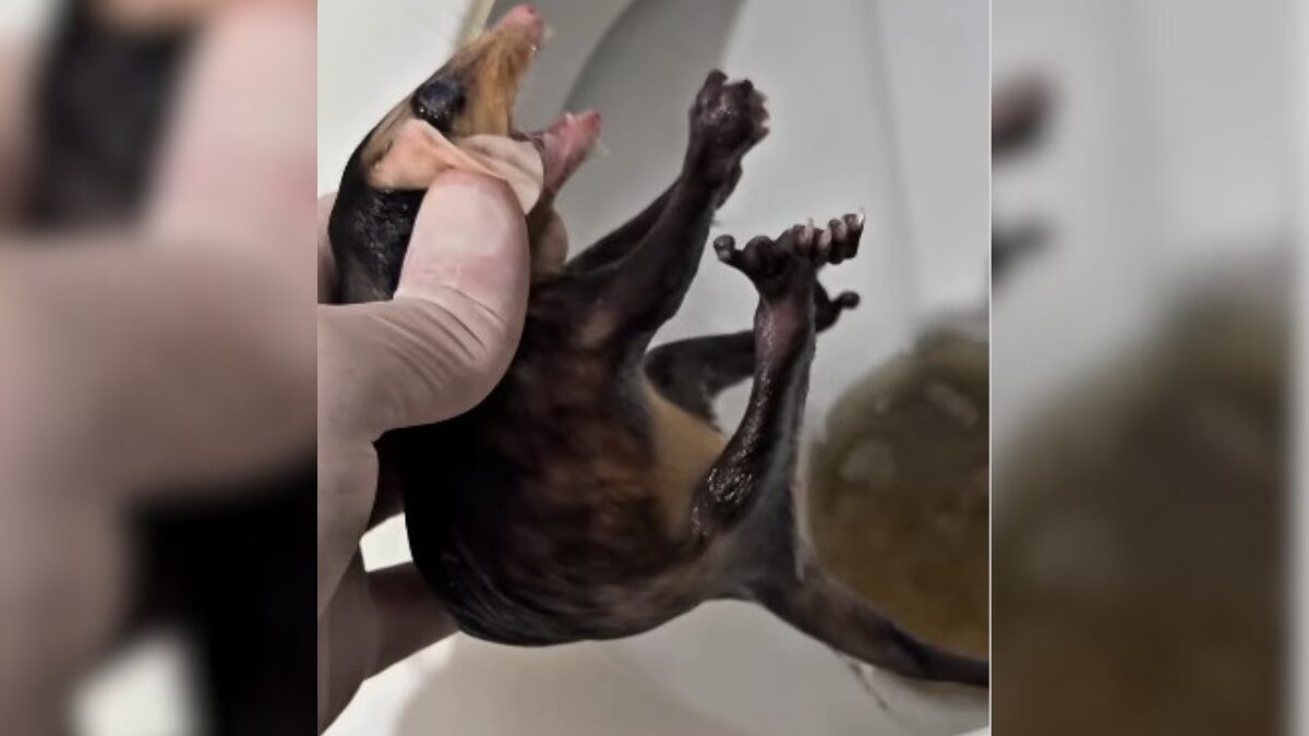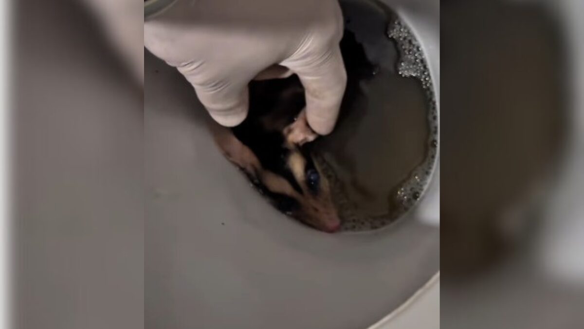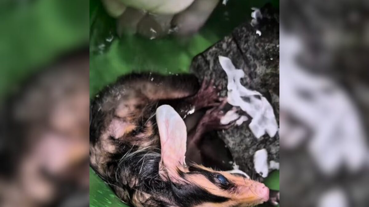 O filhote estava há algum tempo dentro da água gelada com produto químico de uma privada. Durante o resgate, o gambá chegou a fazer tanatose, ou seja, fingiu estar morto em um ato defensivo, comum à espécie.