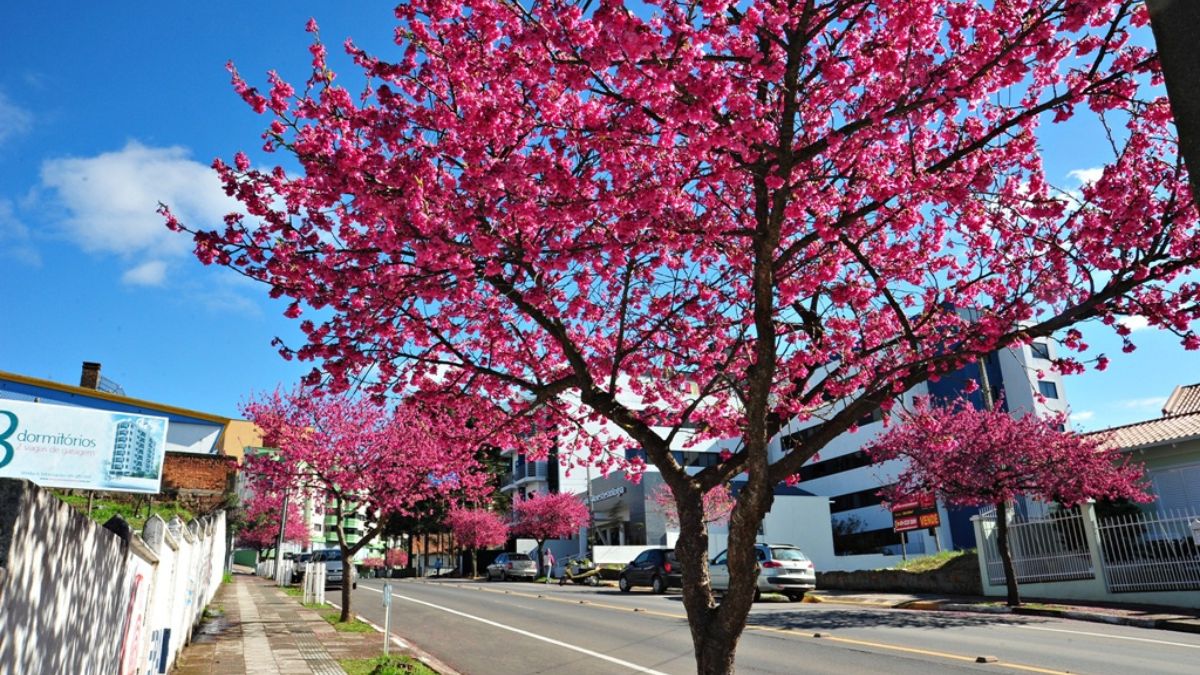 Quem passa pela rua Frei Gabriel em Lages, na Serra catarinense, nesta época do ano se depara com um verdadeiro espetáculo colorido. As cerejeiras ornamentais, em plena florada de inverno, colorem a cidade com tons de rosa e transformam a paisagem urbana em um cenário digno de cartão-postal.