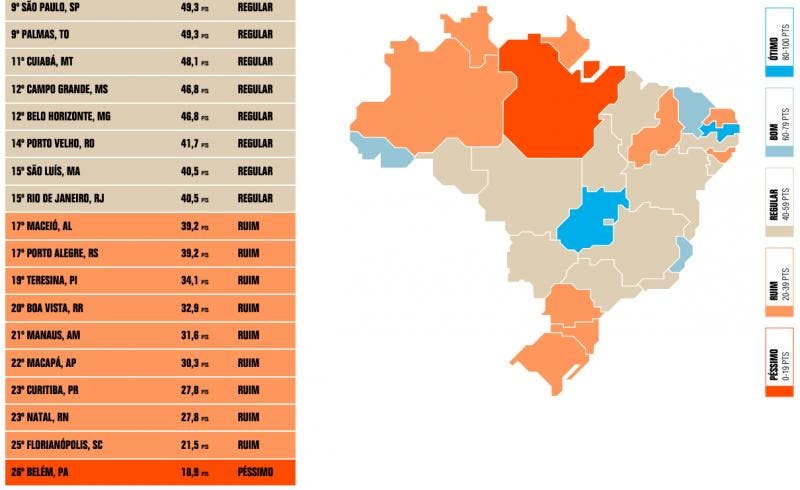O ranking separa estados e municípios conforme a pontuação obtida no levantamento dos dados de transparência nas contratações durante a pandemia. São considerados ótimos aqueles que atingem 80 a 100 pontos, bons de 60 a 79, regulares 40 a 59, ruins 20 a 39 e péssimos 0 a 19. Santa Catarina somou 67 pontos, enquanto Florianópolis obteve 21,5.