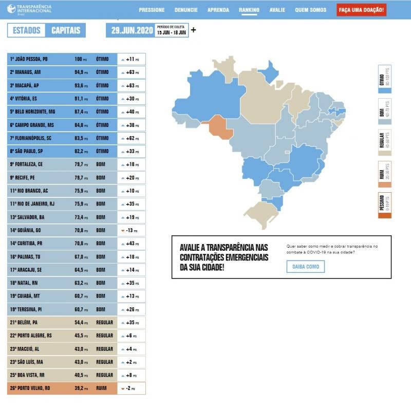 Esses dados são do Ranking de Transparência de Contratações Emergenciais, feito pela organização não-governamental Transparência Internacional.