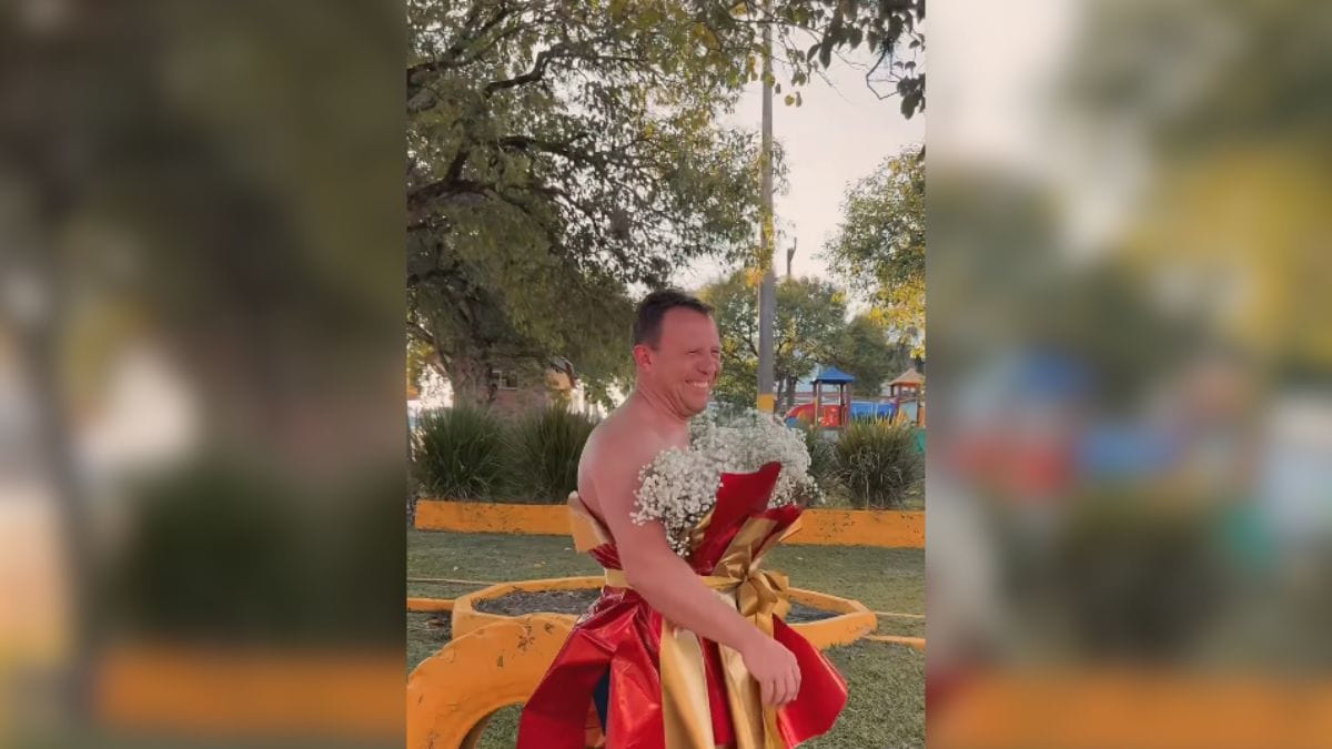 Com mais de um milhão de visualizações, o vídeo divertiu quem assistiu. “O melhor é ele saindo com a cara bem séria de dentro da loja, mas vestido de buquê”, comentou um seguidor. “Esse traje encontramos na loja também?”, brincou uma outra pessoa.