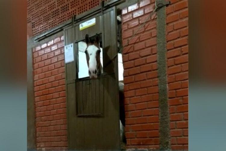 Ele já havia sido trocado de baia algumas vezes por conseguir abrir a tranca de saída. Dessa vez, no entanto, o batalhão registrou o momento.
