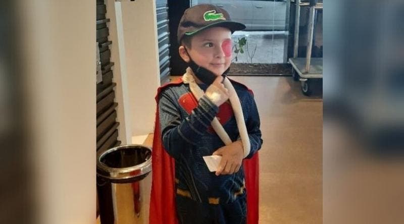 Enzo deixou o Hospital Pequeno Anjo, em Itajaí, vestindo uma fantasia de Super-Homem e baixou a máscara para compartilhar um sorriso tímido encantador com os parentes que o esperavam na recepção do hospital. Ele estava com um tampão no olho e um dos braços apoiado em uma tipoia.