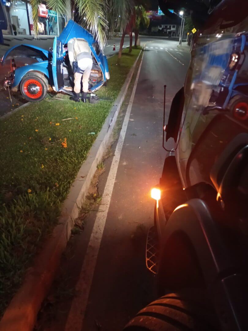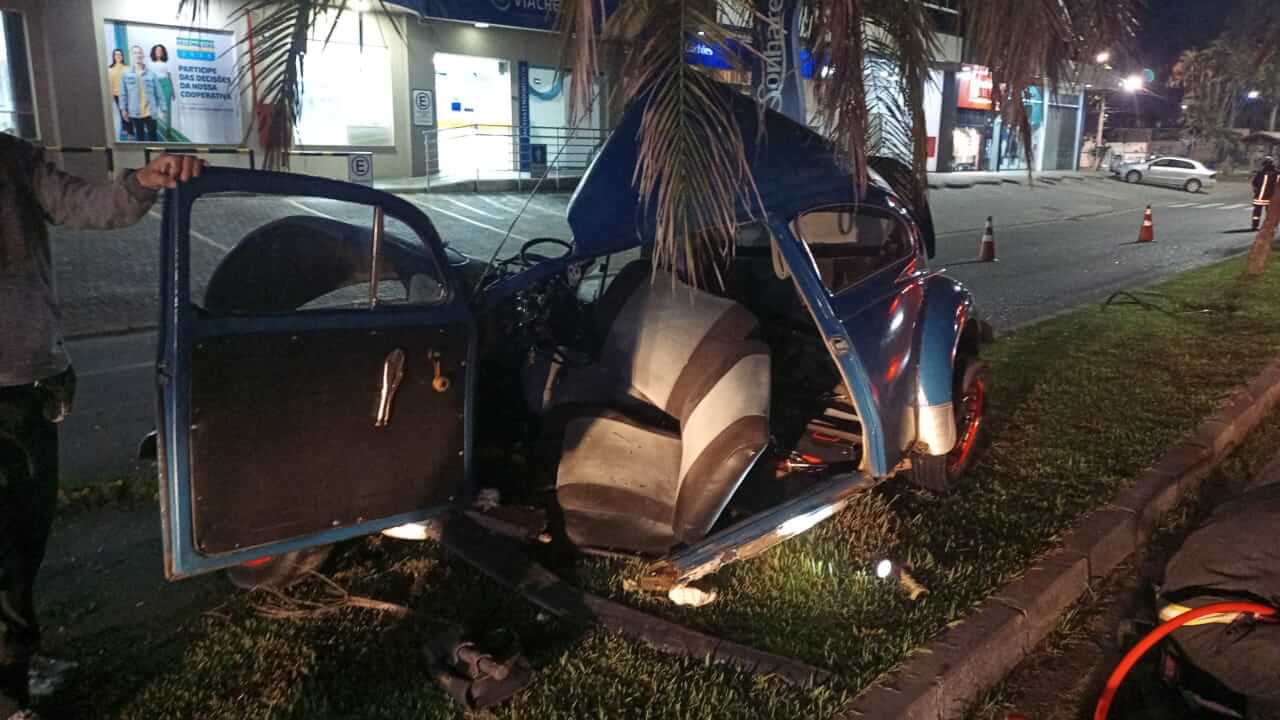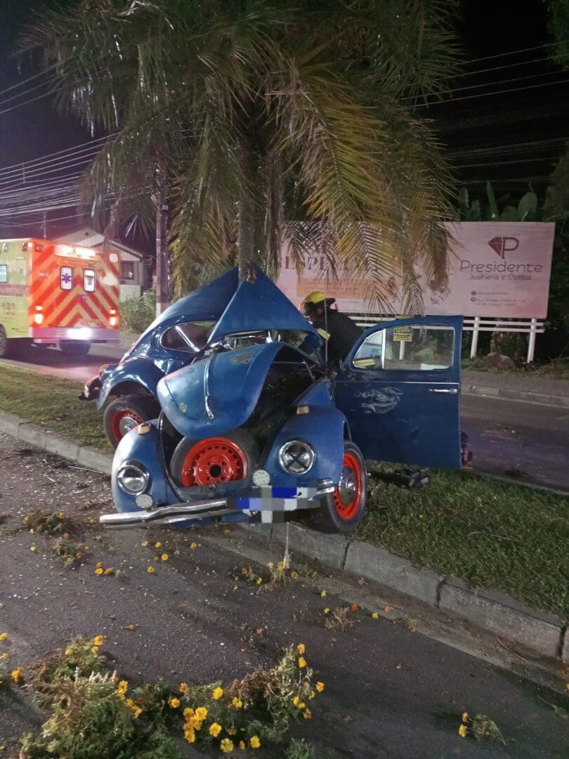 Conforme os bombeiros, a batida aconteceu por volta das 3h45min na rua Marechal Deodoro da Fonseca, na região central. O fusca colidiu contra uma árvore no canteiro central da via e a lataria ficou completamente destruída.