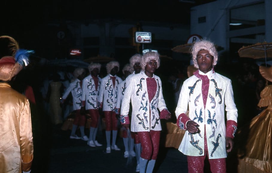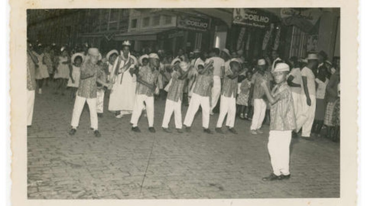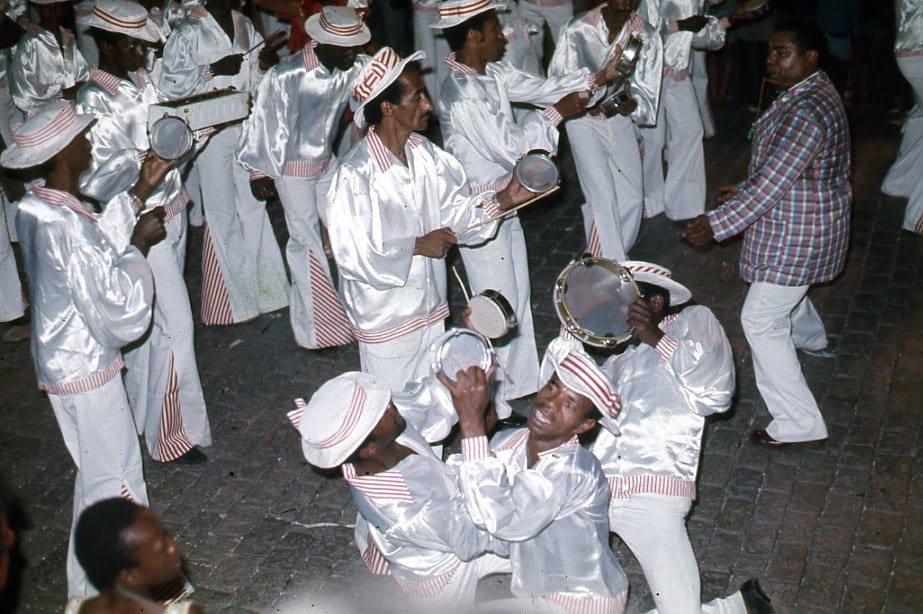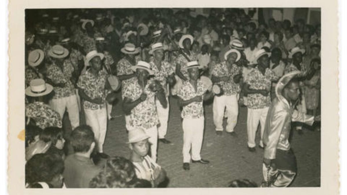 Sambistas se apresentam em carnaval de rua, no Centro de Florianópolis, década de 1970 (Foto: Waldemar Anacleto, Repositório Institucional da UFSC)