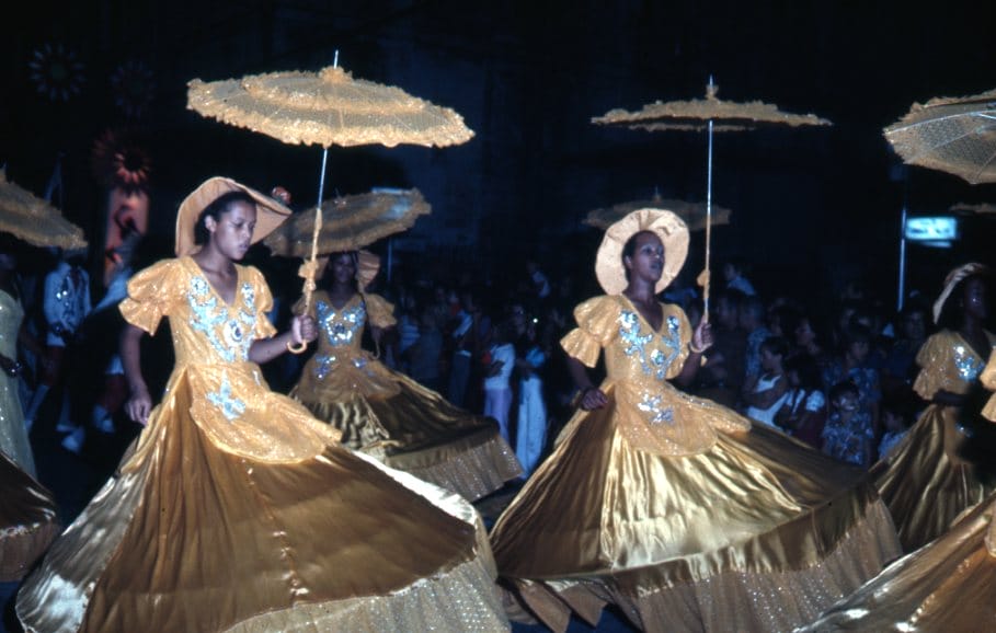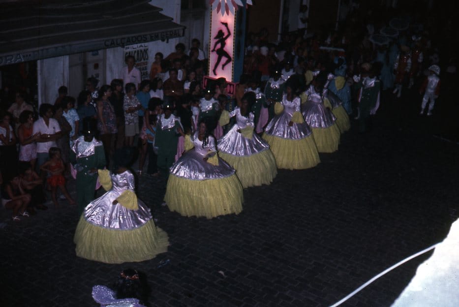 Festa de Carnaval ocorre nas ruas do Centro de Florianópolis. Neste momento, um bloco carnavalesco faz apresentação com danças e trajes, enquanto a população assiste ao lado. Década de 1970 (Foto: Waldemar Anacleto, Repositório Institucional da UFSC)