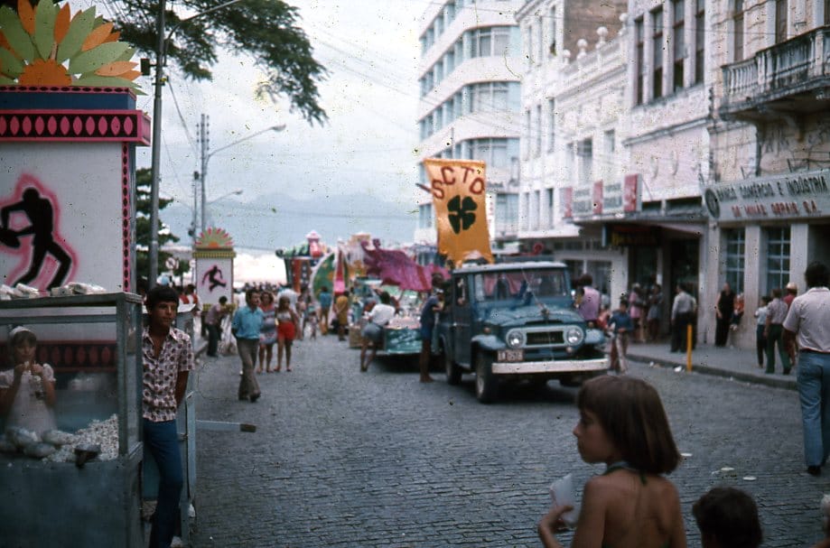 Os blocos de rua também agitavam a capital catarinense no século passado, como registram fotos da década de 1970 do acervo do fotógrafo Waldemar Anacleto (digitalizadopela UFSC). Nas imagens, vemos fantasias coloridas em desfile próximo a Praça XV de Novembro.