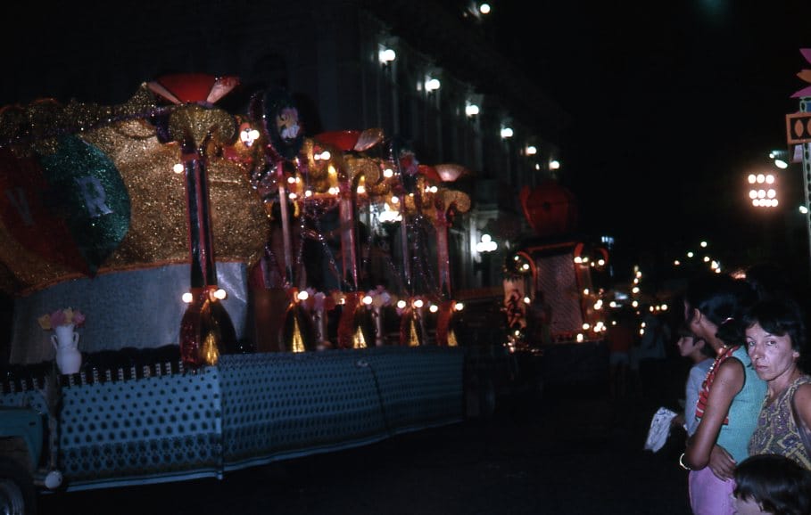 Festa de carnaval com carros alegóricos no Centro de Florianópolis, próximo ao Palácio do Governo na década de 1970 (Foto: Waldemar Anacleto, Repositório Institucional da UFSC)