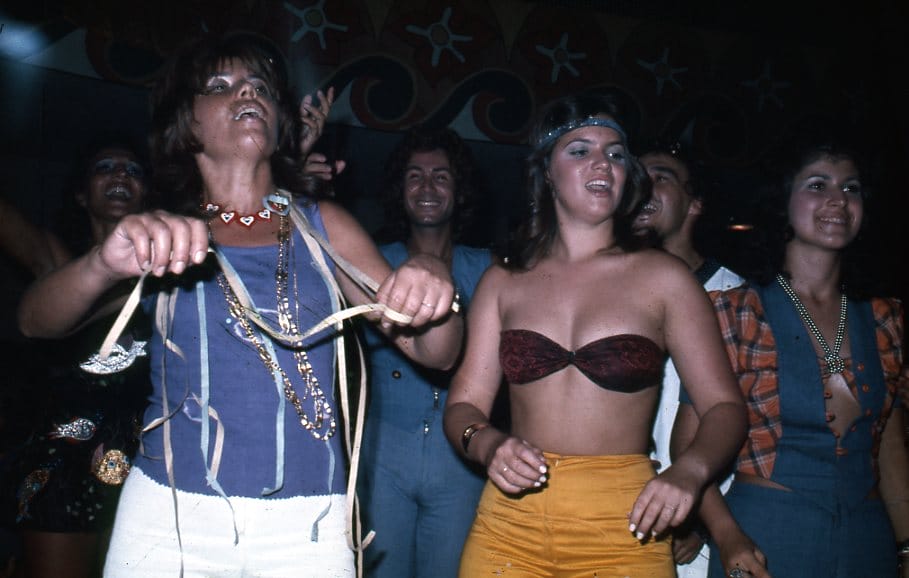 Mulheres e homens se divertem em festa de Carnaval em Florianópolis, na década de 1970 (Foto: Waldemar Anacleto, Repositório Institucional da UFSC)