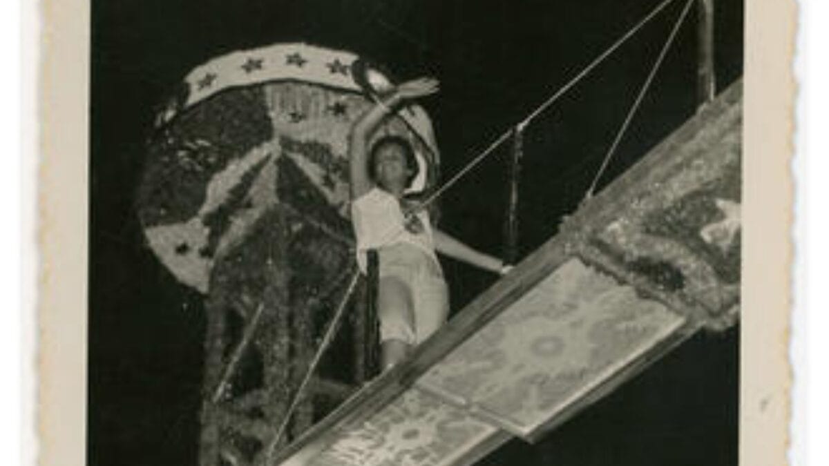 Pessoa sobre carro de mutação no desfile da Sociedade Carnavalesca Granadeiros da Ilha no carnaval de 1962 (Foto Arquivo Público de Santa Catarina)