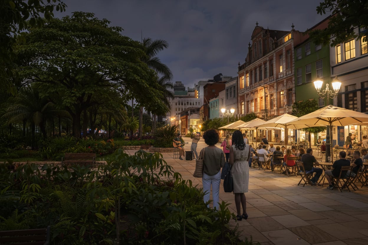 Com cerca de 8 mil metros quadrados, a praça-jardim prevê a criação de pavilhões gastronômicos, quiosques, fonte interativa de água no solo, áreas de brincar e espaços ampliados para mesas e cadeiras de bares e restaurantes. O projeto inclui ainda vegetação nativa, superfícies permeáveis e jardins de chuva, além de estruturas de sombra, assentos públicos e iluminação.