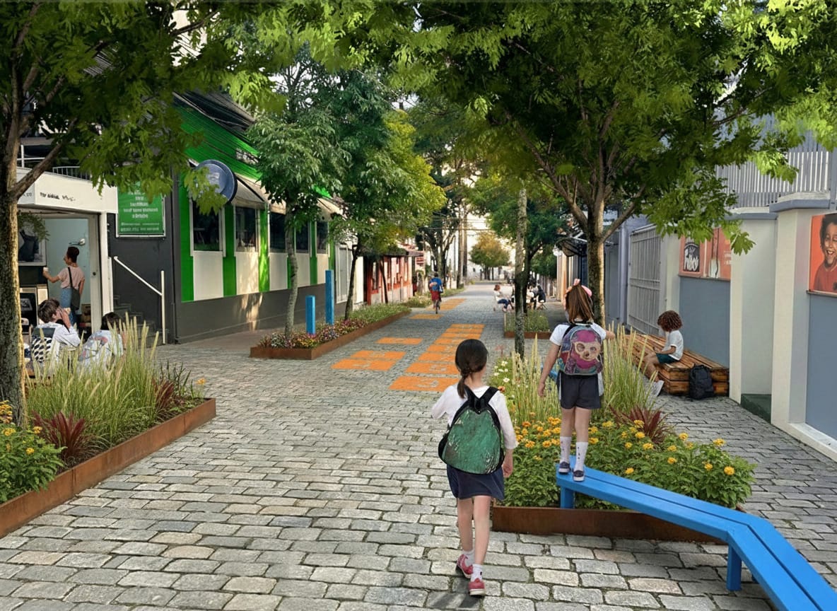O projeto inclui medidas de acalmamento do tráfego, áreas organizadas de embarque e desembarque escolar, baia específica para ônibus, bicicletário coberto e melhoria da visibilidade nos pontos de parada. Ao longo da rua, o desenho urbano incorpora arborização para sombreamento, pavimentos mais permeáveis e marcações lúdicas no chão, além de pequenos espaços de convivência com bancos, arquibancadas, mesas de jogos e áreas para atividades culturais e recreativas.