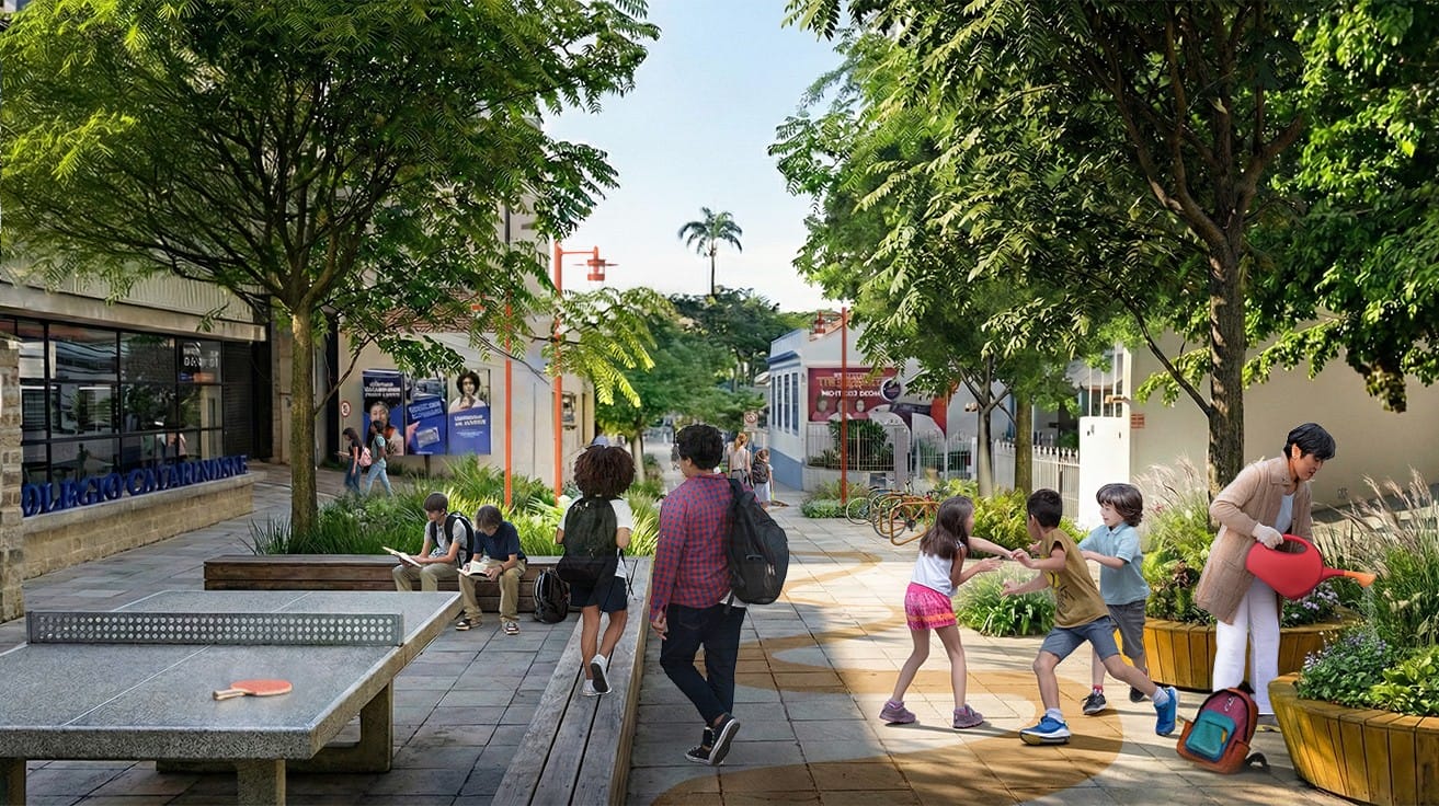 O projeto também propõe a implantação de uma zona escolar na Rua Esteves Júnior, incluindo as praças dos Namorados, Esteves Júnior e o Largo São Sebastião. A ideia é promover maior sociabilidade na rua, com mais áreas verdes e foco na circulação de pedestres, em vez de carros.