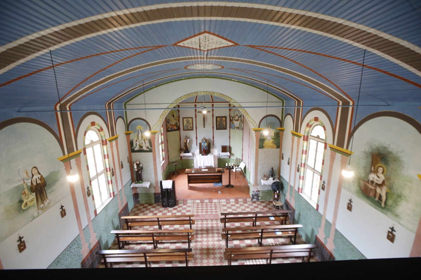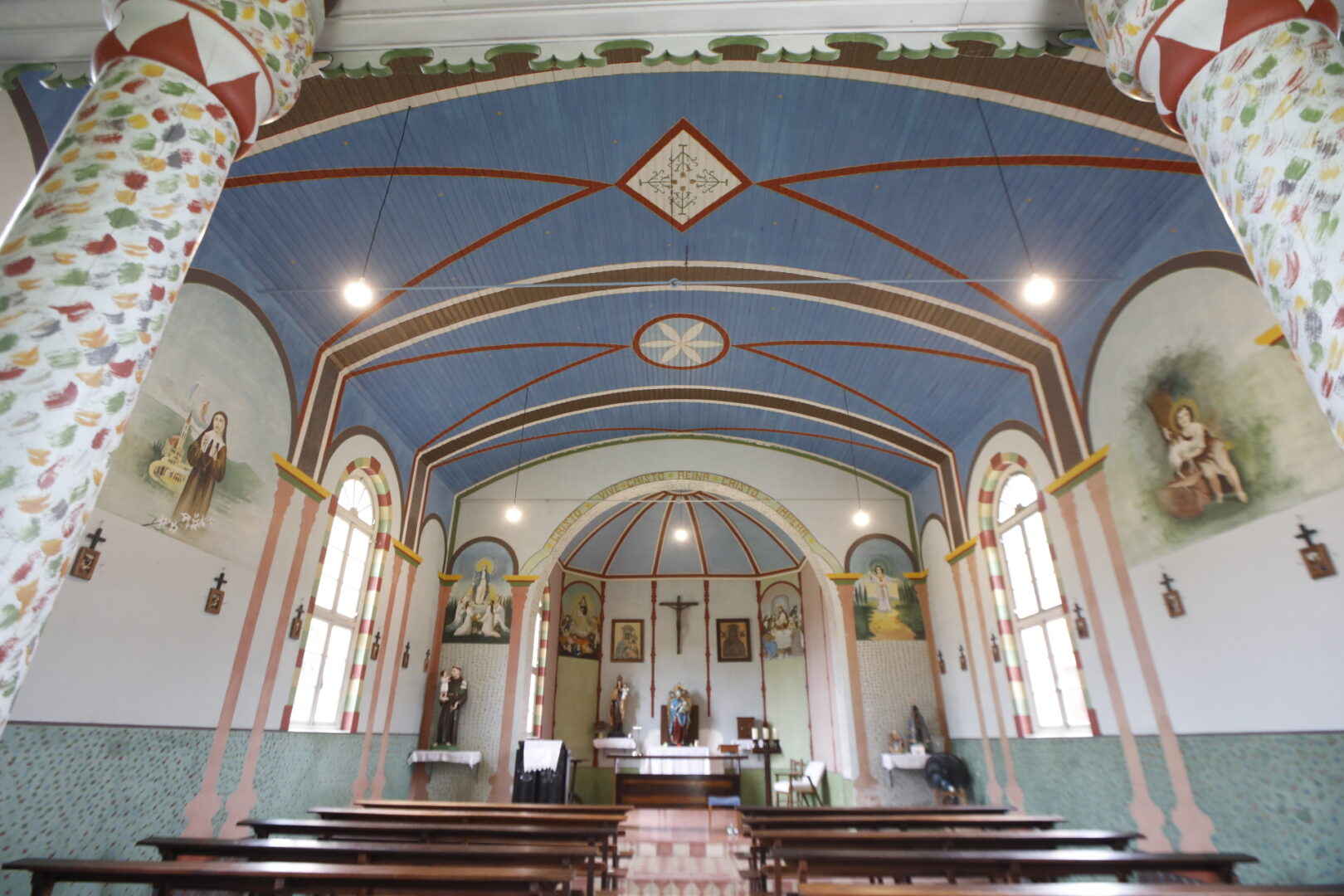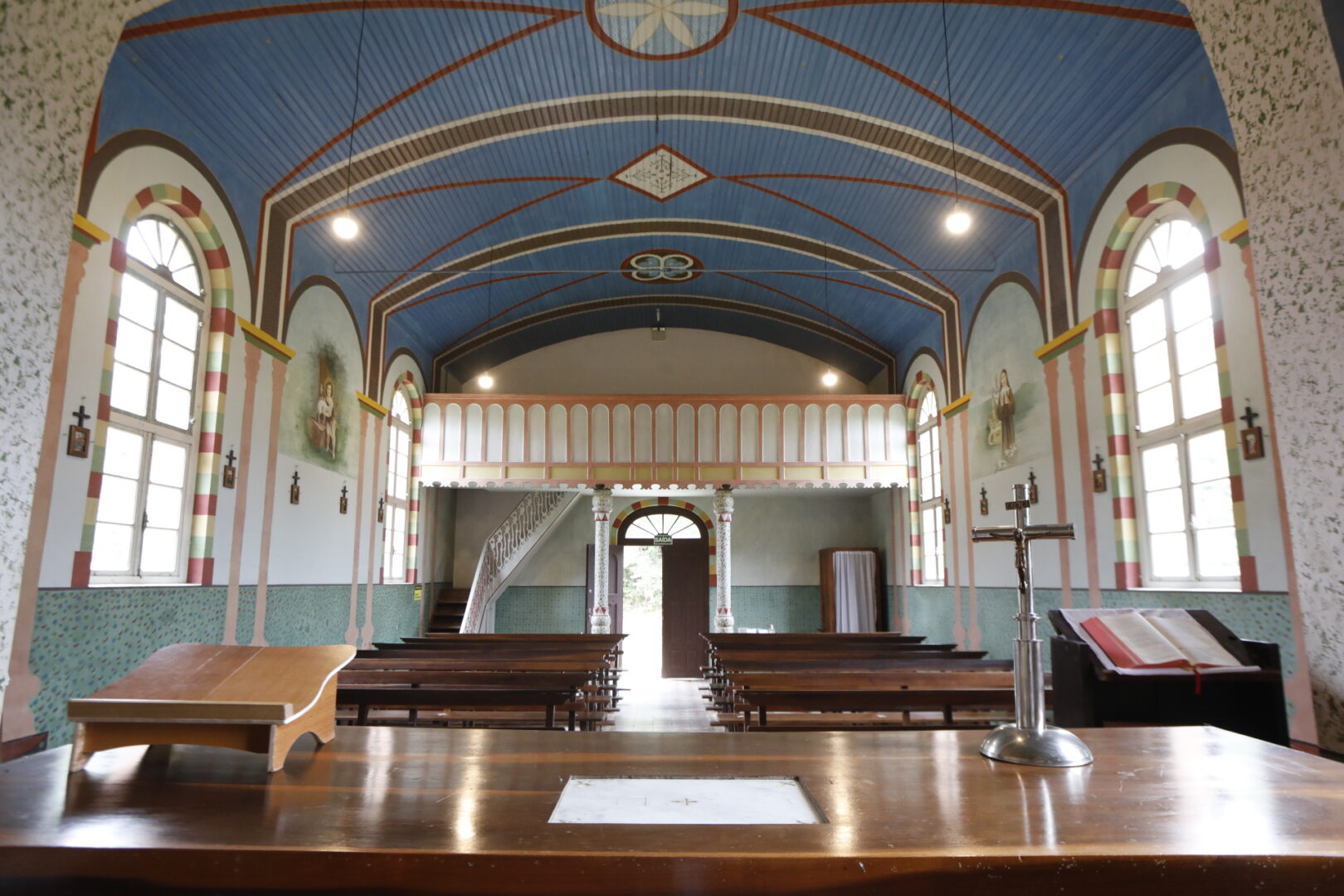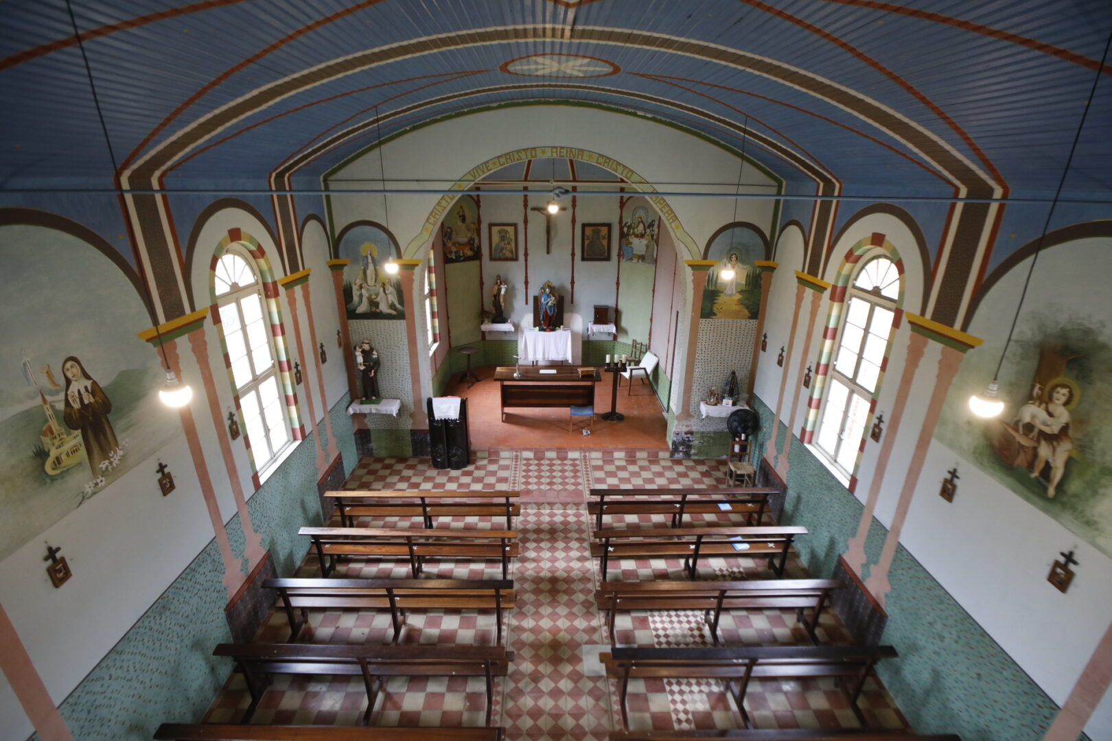 Tombada em nível federal desde 2007, a igreja começou a ser erguida na década de 1920 pelo alemão Júlio Stoy e é uma verdadeira exuberância por dentro. As cuidadosas pinturas, que foram restauradas pelo Instituto do Patrimônio Histórico e Artístico Nacional (Iphan) em 2016, por exemplo, trazem cor ao pequeno ambiente bucólico. O teto azulado com listras vermelhas, o piso em xadrez, os banquinhos de madeira. Cada detalhe torna a capela um espaço totalmente singular.