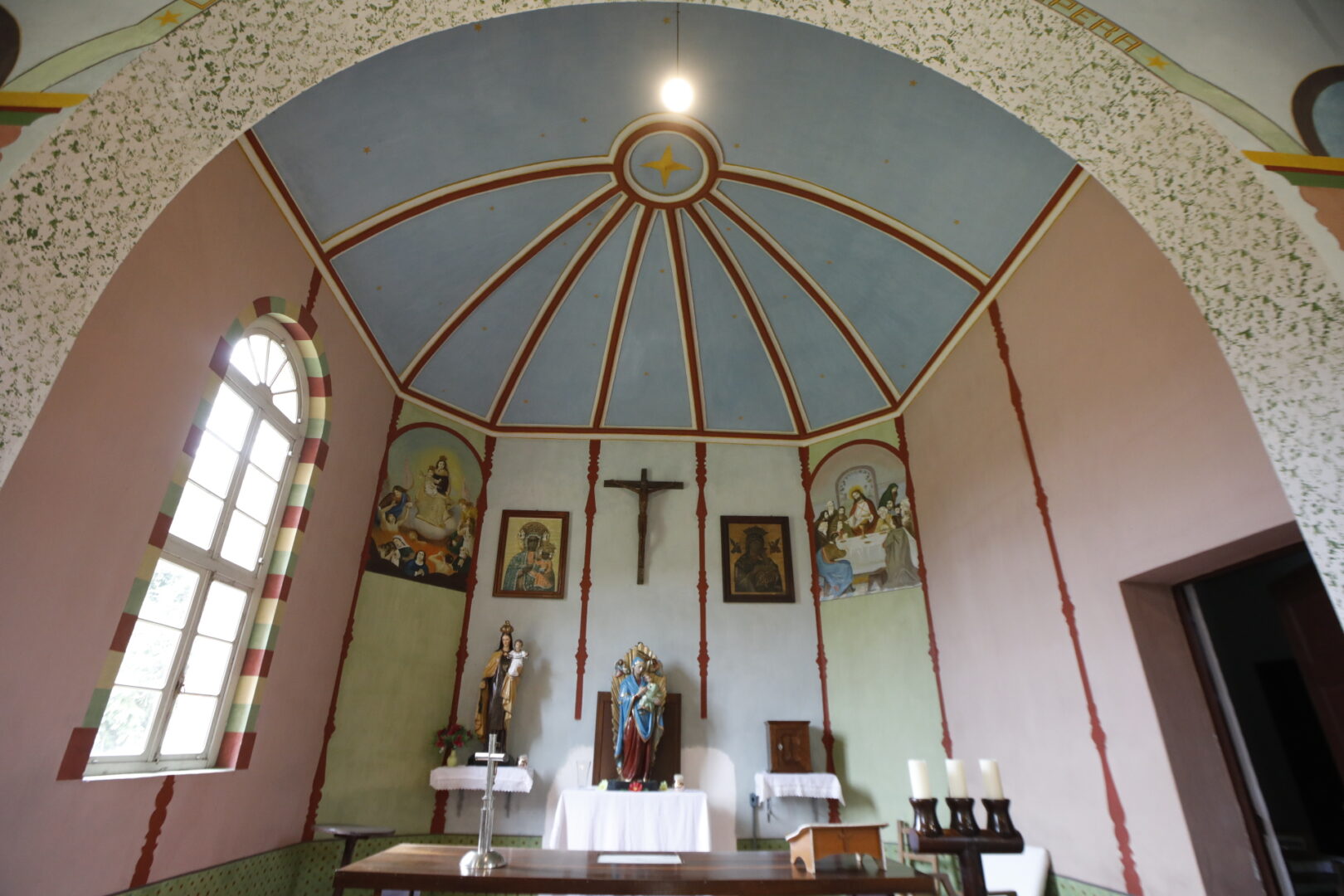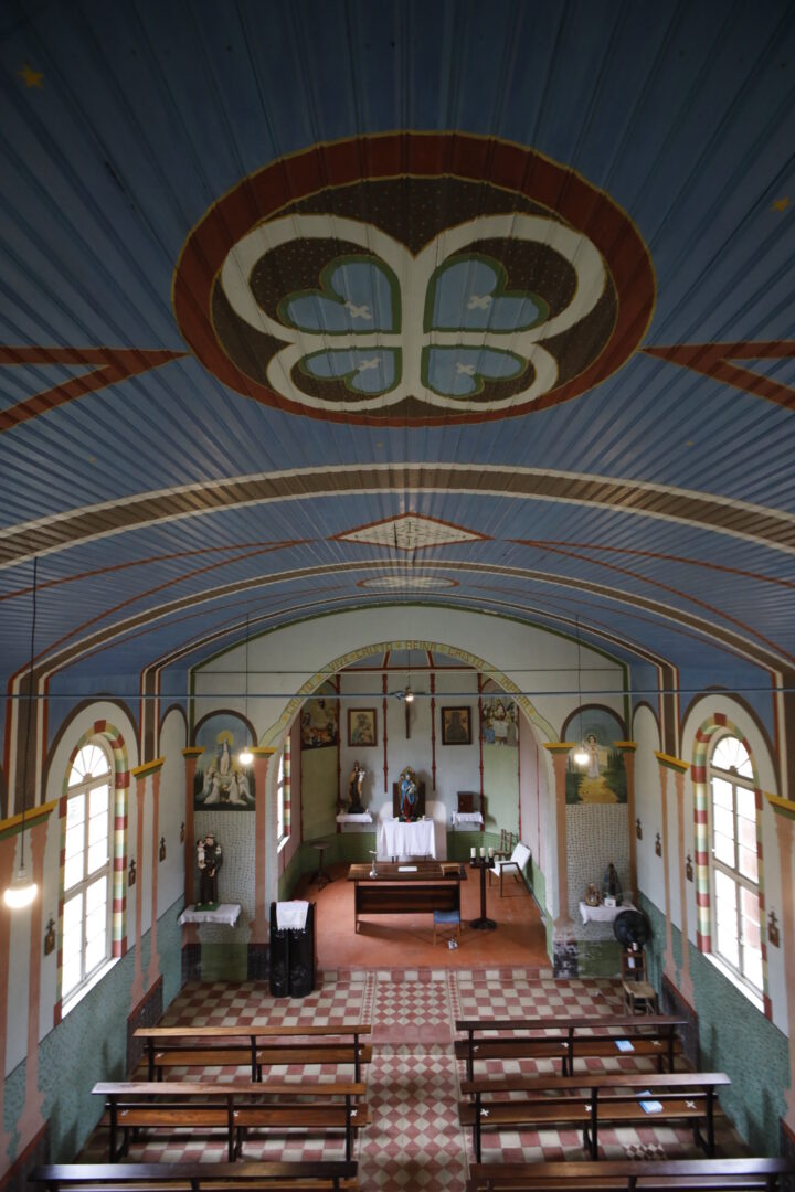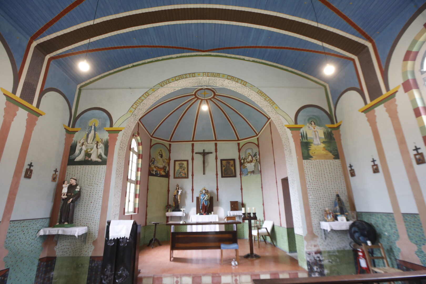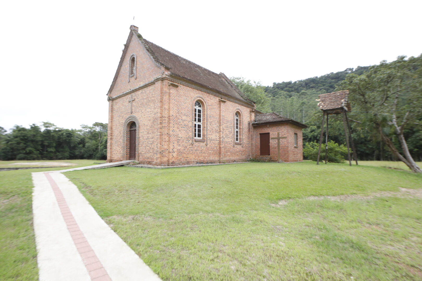 Tombada em nível federal desde 2007, a igreja começou a ser erguida na década de 1920 pelo alemão Júlio Stoy e é uma verdadeira exuberância por dentro. As cuidadosas pinturas, que foram restauradas pelo Instituto do Patrimônio Histórico e Artístico Nacional (Iphan) em 2016, por exemplo, trazem cor ao pequeno ambiente bucólico. O teto azulado com listras vermelhas, o piso em xadrez, os banquinhos de madeira. Cada detalhe torna a capela um espaço totalmente singular.
