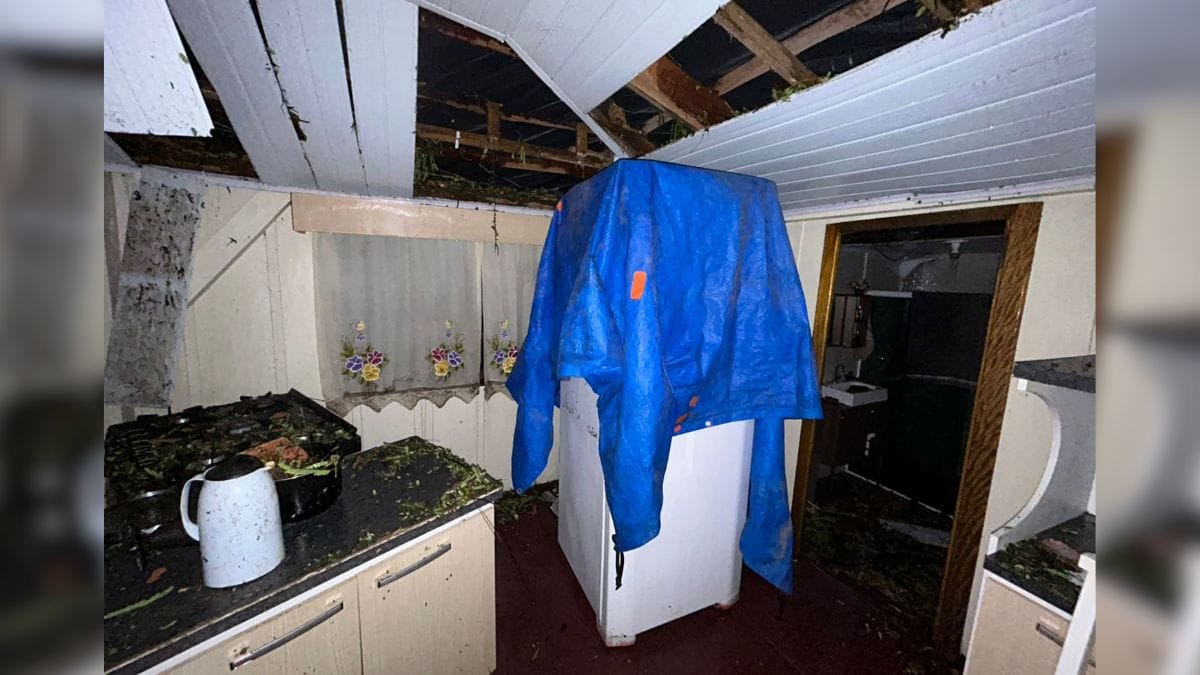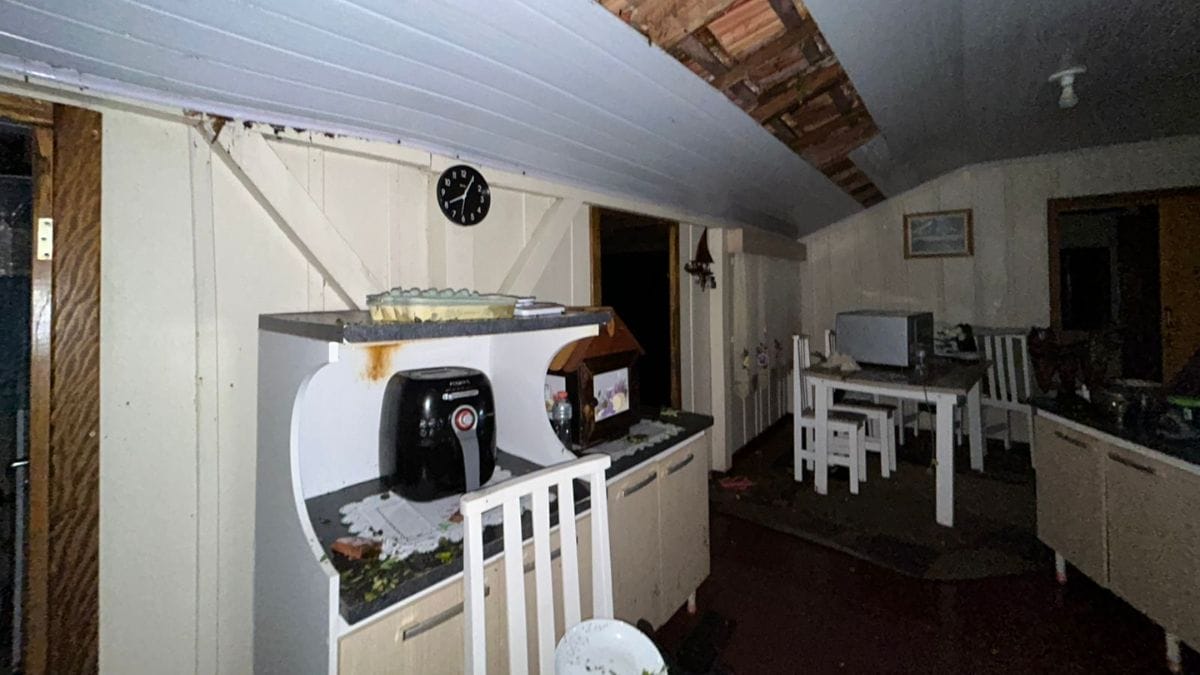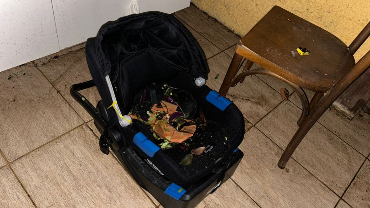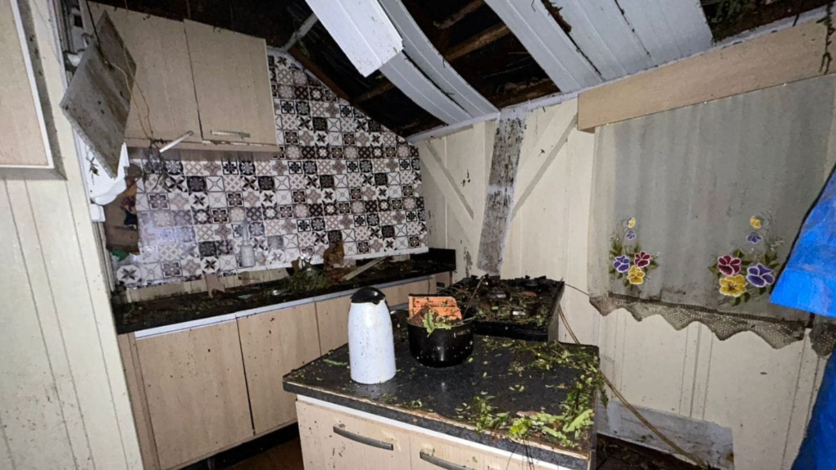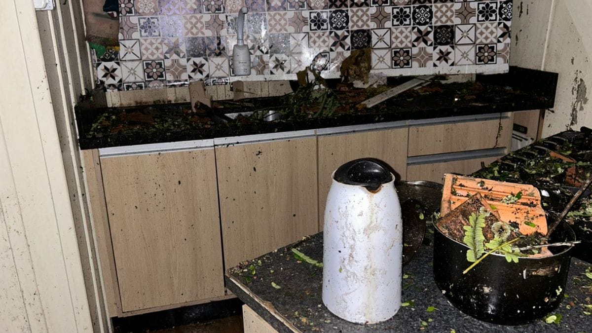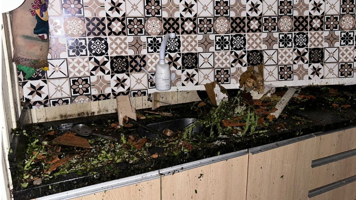 No interior da casa, eletrodomésticos e móveis acabaram sendo atingidos pelos destroços de telhas. Pedaços da construção foram para sobre a cadeira do bebê. Agora, para reconstruir o lar, a família conta agora com a ajuda de amigos.