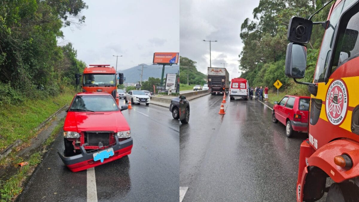 Segundo os bombeiros, o homem ferido apresentava suspeita de traumatismo craniano e cervicalgia (dor na região do pescoço), mas foi encaminhado consciente e orientado ao Hospital Governador Celso Ramos. Ele dirigia uma Fiorino pertencente a uma empresa de telefonia.