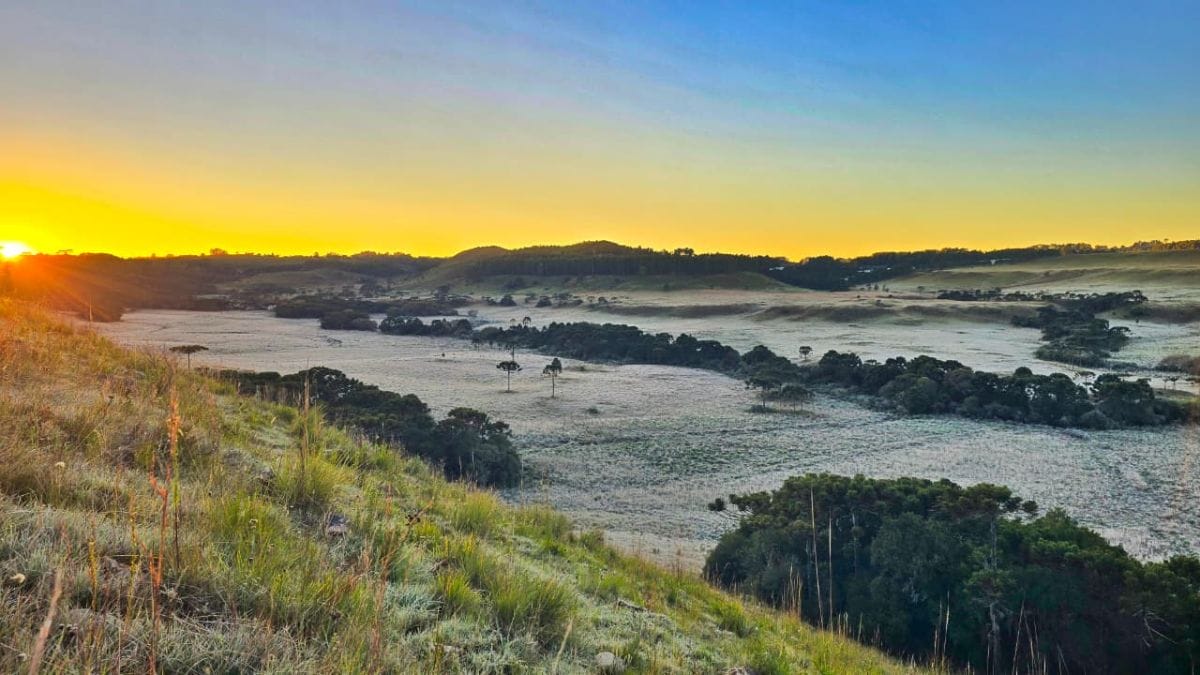 Imagens impressionantes mostram a paisagem transformada pela geada. No Vale Caminhos da Neve, em São Joaquim, o pasto virou um “tapete branco”. Uma ponte, em Bom Jardim da Serra, também amanheceu coberta por geada.