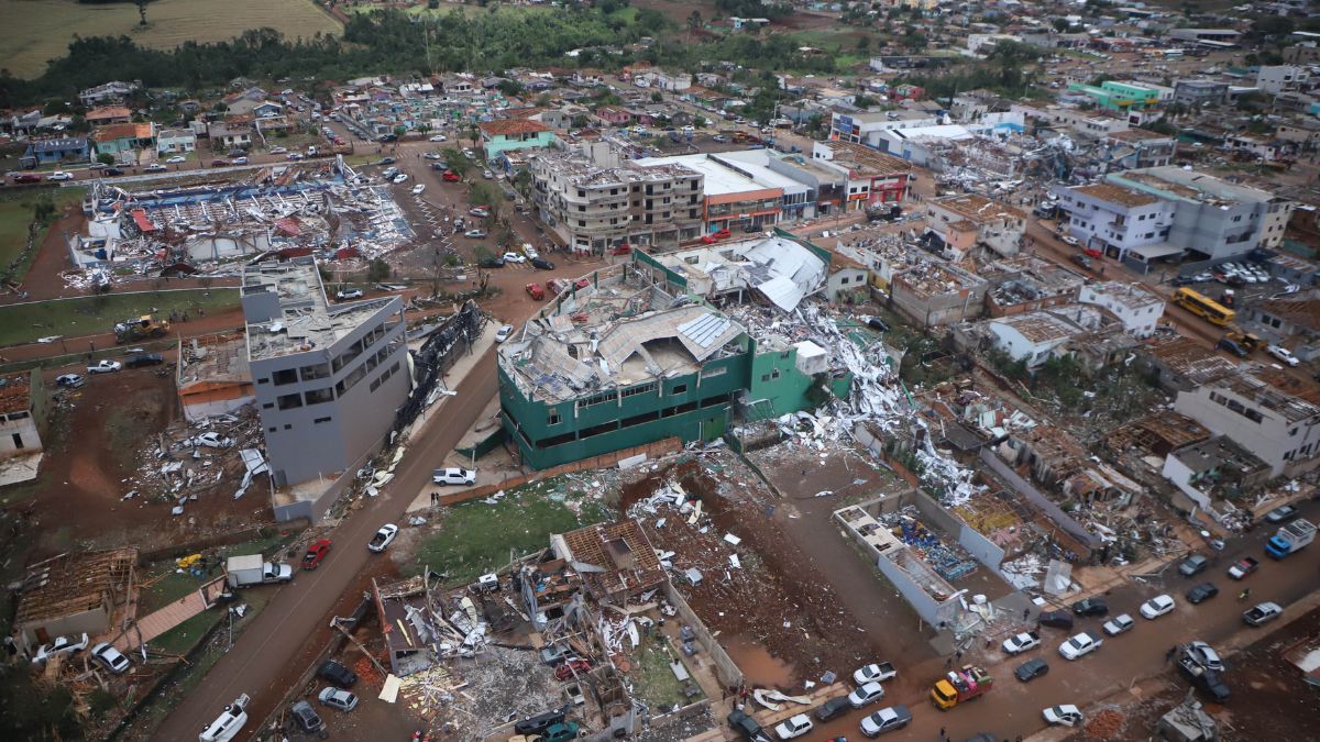 As imagens que mostram o estrago deixado por um tornado em Rio Bonito do Iguaçu, no Paraná, já são impressionantes por si só. Mas ao comprar o antes e depois da cidade ilustra ainda mais o tamanho da destruição. A Defesa Civil informou que o fenômeno deixou ao menos 90% da cidade destruída, com casas destelhadas, imóveis danificados e postes de energia no chão.