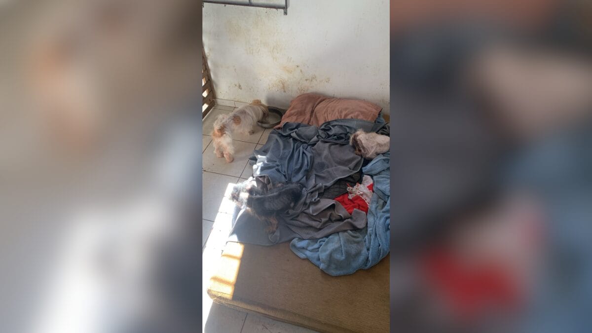 Os cachorros foram encontrados em ambiente insalubre, confinados, sem água e alimentação disponíveis. Além disso, ambos estavam em estado de extrema magreza, com problemas de pele identificados pela equipe. O imóvel estava bastante sujo, com fezes e odor fétido, segundo a polícia.