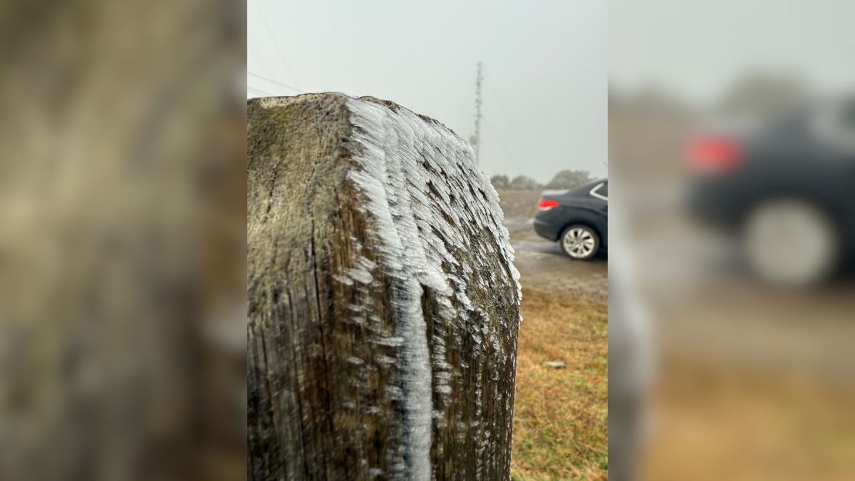 A combinação de umidade com vento formou finas camadas de gelo sobre árvores, cercas e postes, criando uma paisagem típica de cartão-postal.