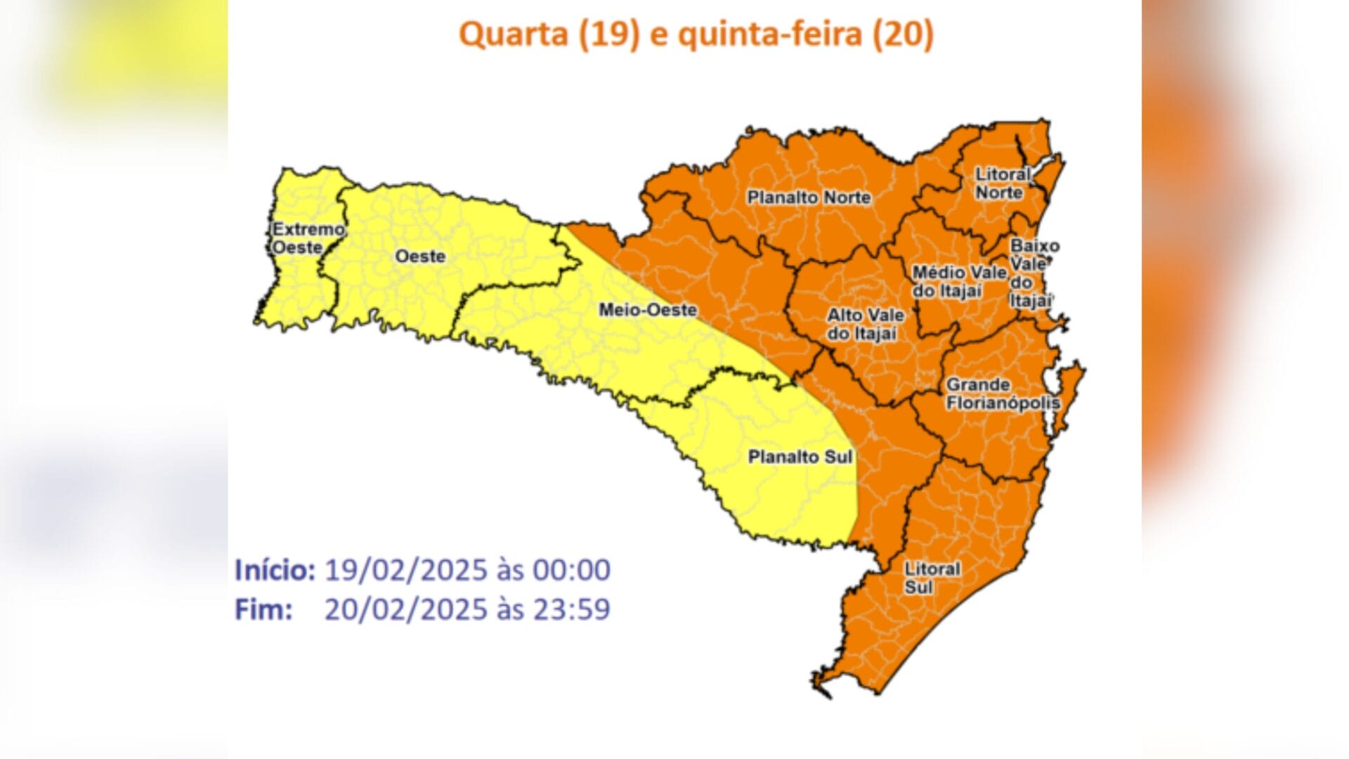 A frente fria que segue avançando por Santa Catarina mantém o tempo instável, com chuva e nebulosidade em todas as regiões catarinenses nesta quarta-feira (19). Segundo a Defesa Civil, as condições para temporais aumentam no fim do dia. A chuva intensa pode vir acompanhada de raios, rajadas de vento e eventual queda de granizo, especialmente entre os Planaltos e o litoral catarinense.