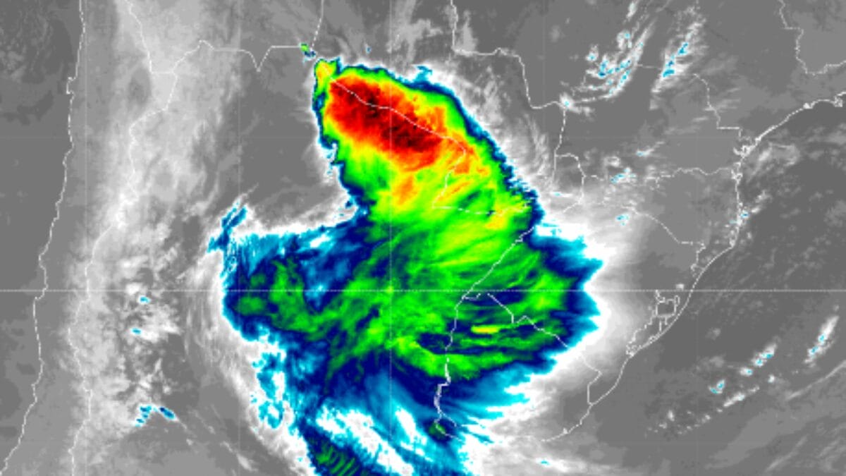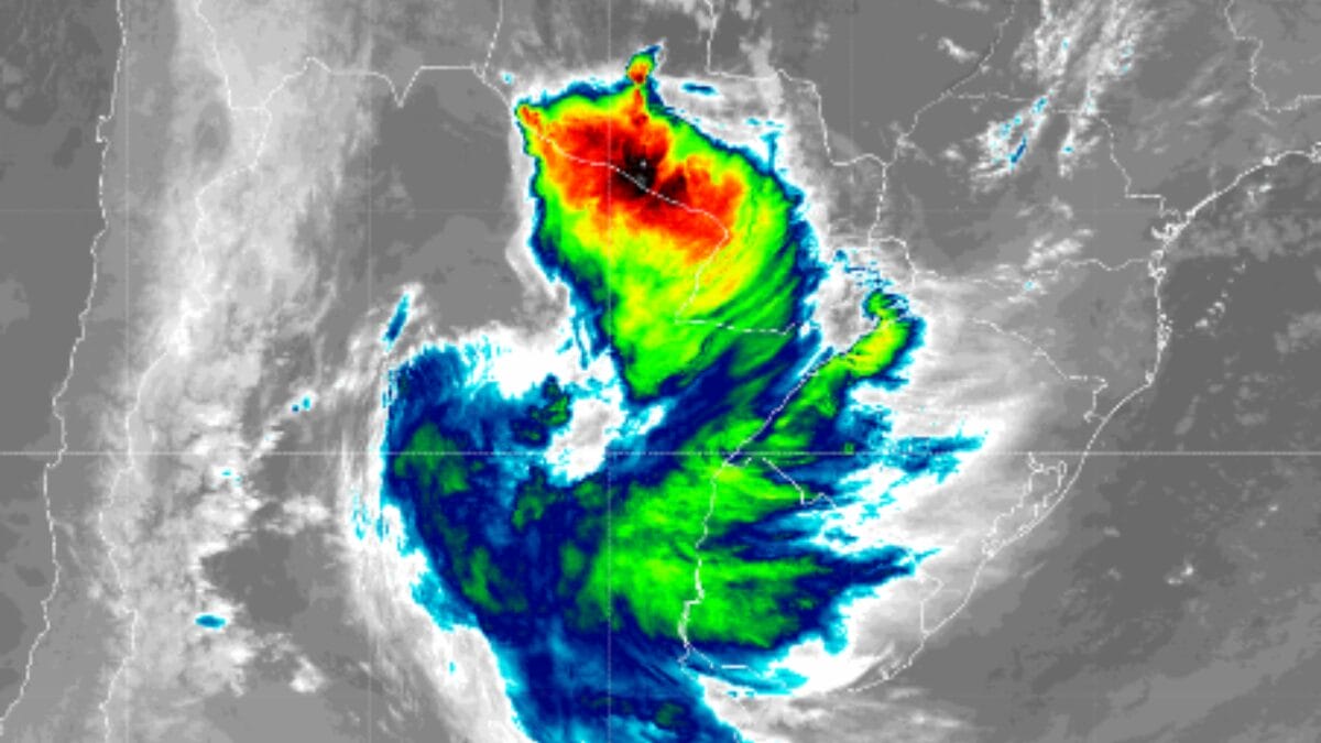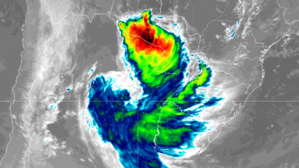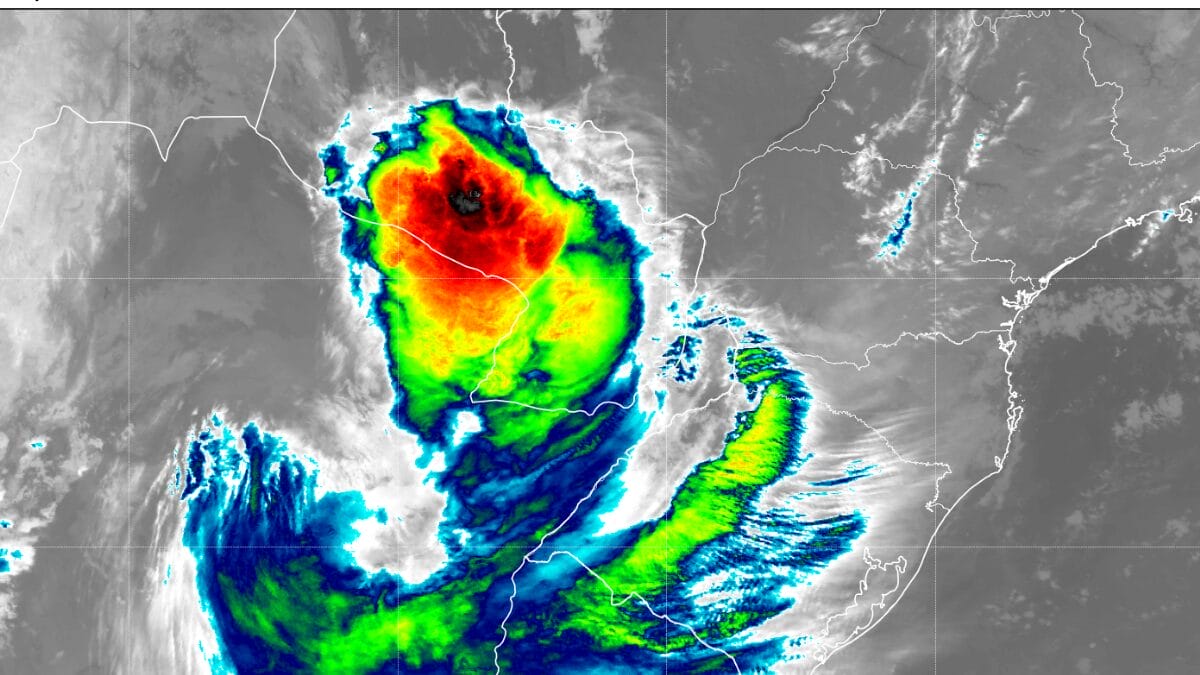 Pelas imagens de satélite, é possível ver nuvens com desenvolvimento vertical e topo frio sobre o Paraguai, com um sistema de baixa pressão conectado a um ciclone extratropical na Argentina.