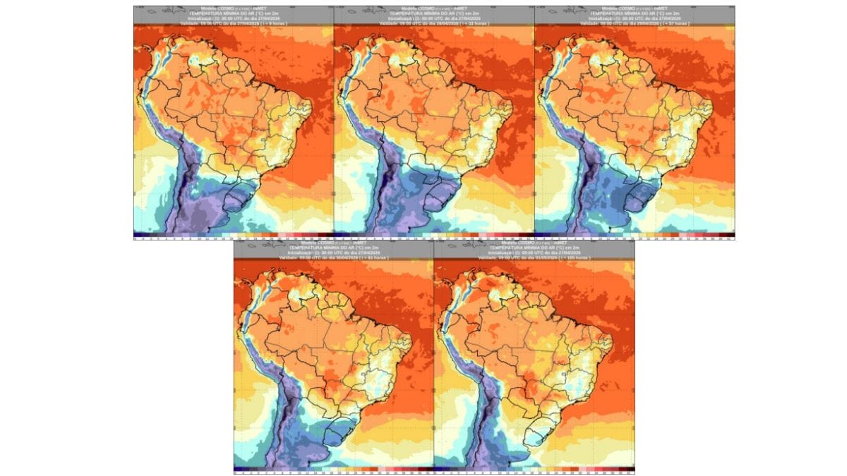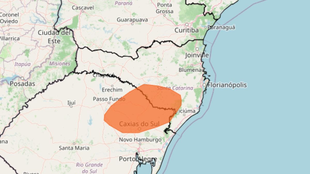 O Inmet também emitiu outro alerta de “perigo potencial” para declínio de temperatura em Santa Catarina, Rio Grande do Sul e Paraná. O aviso começou à meia-noite desta segunda-feira (27) e segue até o fim de terça-feira (28).