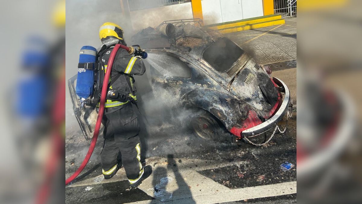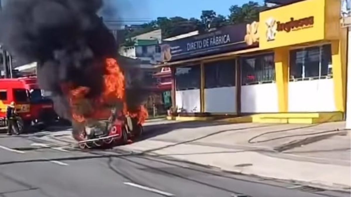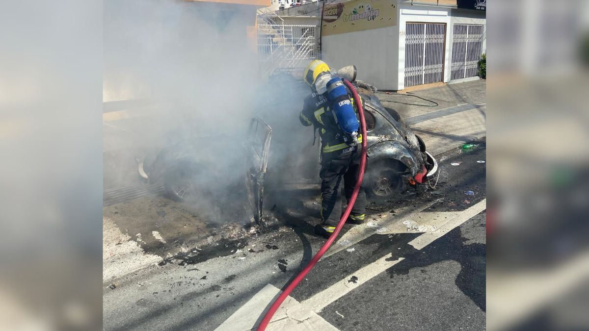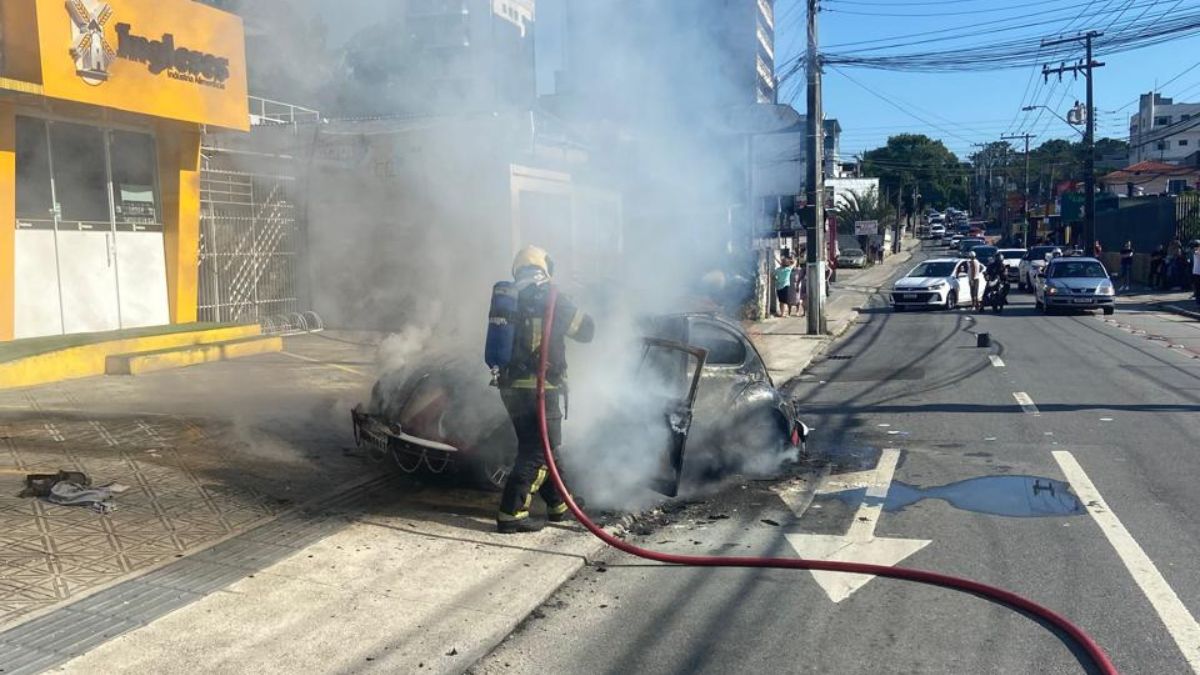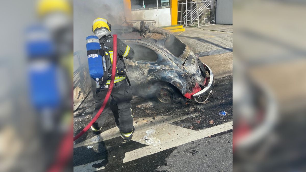 Um carro do antigo modelo Fusca pegou fogo e ficou completamente destruído durante a tarde de domingo (5) em Florianópolis. O incêndio mobilizou o Corpo de Bombeiros Militar e deixou impactos no trânsito no bairro Pantanal.