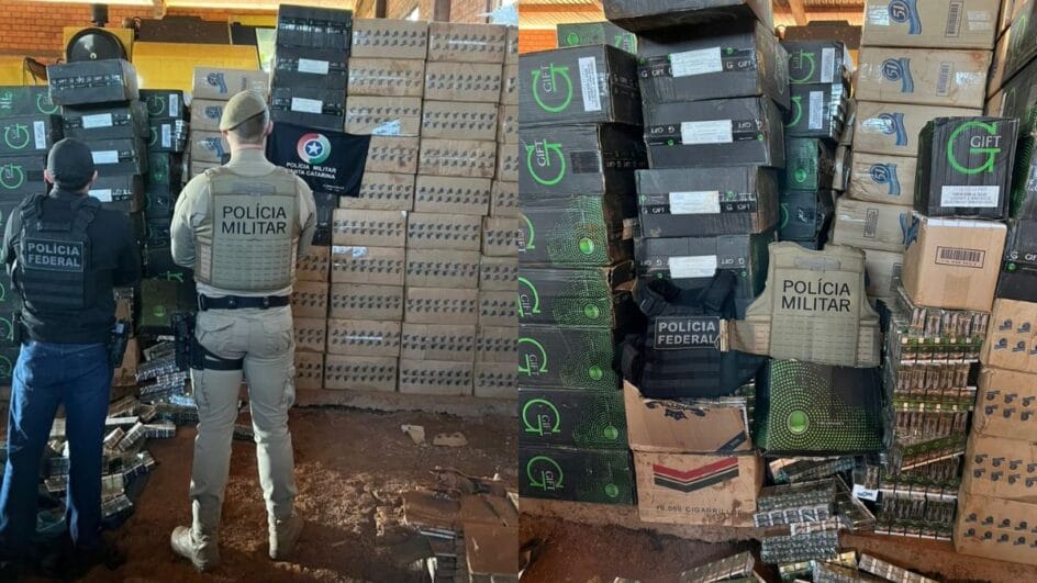 Dois homens foram presos em flagrante com cerca de 100 mil maços de cigarros contrabandeados do Paraguai nesta terça-feira (11), em Dionísio Cerqueira, no Oeste catarinense. A apreensão ocorreu próximo à região de fronteira com a Argentina.