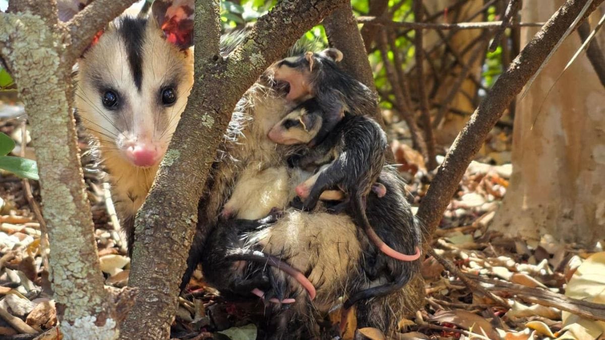 — Os gambás são marsupiais, ou seja, possuem uma bolsa chamada marsúpio semelhante à dos cangurus, onde os filhotes permanecem logo após o nascimento. Dentro do marsúpio, eles se alimentam do leite materno e ficam protegidos até atingirem um tamanho adequado. Quando crescem um pouco mais, passam a se agarrar nas costas da mãe, por isso é comum observar gambás carregando vários filhotes dessa forma — conta.
