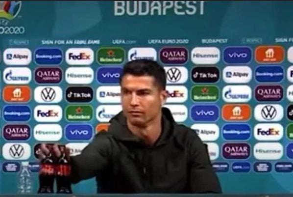 Tudo que um astro do esporte faz acaba gerando grande repercussão, e o gesto de Cristiano Ronaldo de retirar duas garrafas de Coca-Cola antes de uma entrevista coletiva nesta segunda-feira (14) comprovou isso: “Água!”, exclamou o jogador, levantando uma garrafa contendo água.