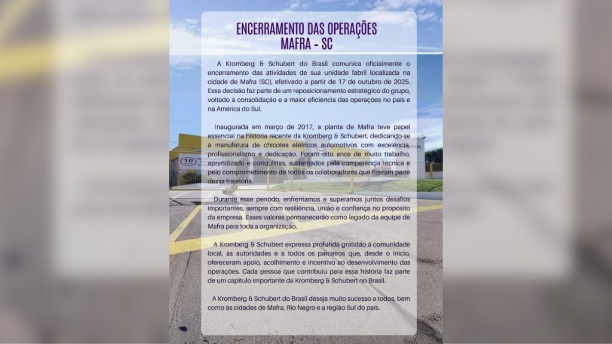 A Kromberg & Schubert do Brasil comunica oficialmente o encerramento das atividades de sua unidade fabril localizada na cidade de Mafra (SC), efetivado a partir de 17 de outubro de 2025. Essa decisão faz parte de um reposicionamento estratégico do grupo, voltado à consolidação e à maior eficiência das operações no país e na América do Sul.