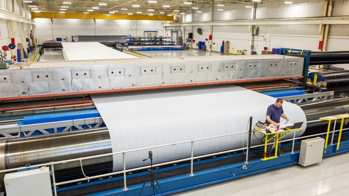 A unidade de Indaial pertence ao segmento mais tradicional da Albany, o Machine Clothing (na tradução literal, “roupas para máquinas). Na prática, a fábrica produz mantas e feltros técnicos que vestem as enormes máquinas de papel. Sem esses tecidos de alta engenharia, capazes de suportar temperaturas extremas, pressão e atrito contínuo, não é possível formar, prensar ou secar a folha de papel em alta velocidade.