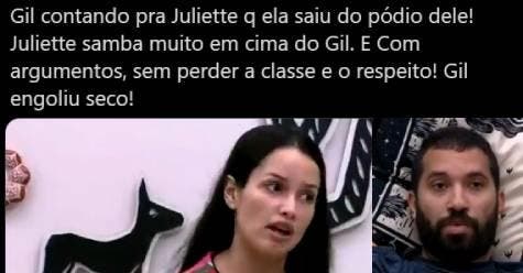 Gil contando pra Juliette q ela saiu do pódio dele! Juliette samba muito em cima do Gil. E Com argumentos, sem perder a classe e o respeito! Gil engoliu seco!